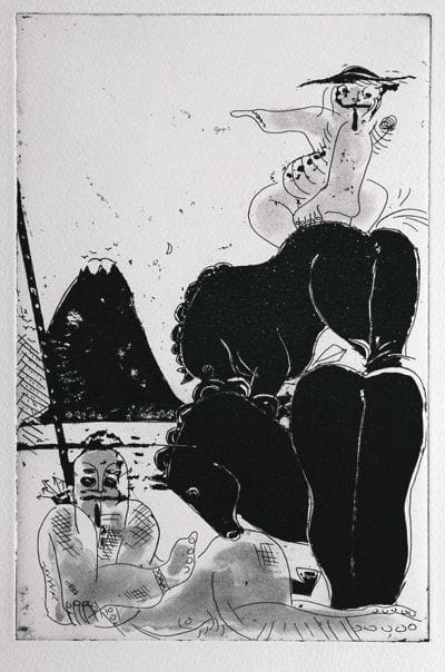 Ambika Chadha, 2024: KALI, mixed media on canvas, 92cm x 90cm (left) Anna Kodz, 2022: On the Hiuumaa Island, photopolymer gravure, 15cm x 21cm
