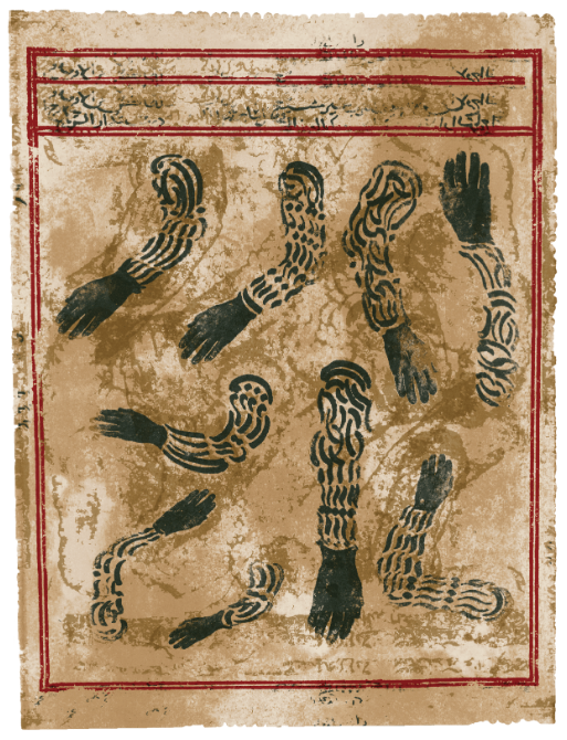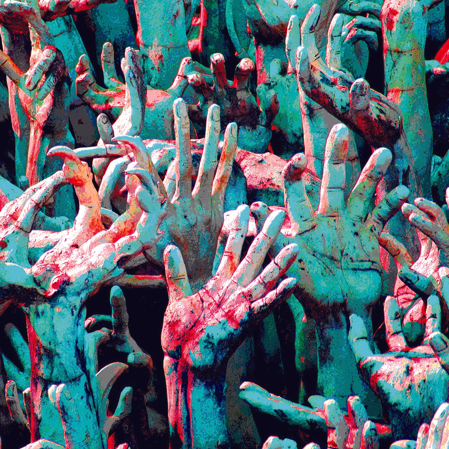 Mohammad Barrangi, 2021: MY HANDS (MONOTONE), screenprint on Fabriano Rosaspina Avorio, 76 x 56cm (left) Oktaravianus Bakara, 2025: The Solliloquy of Aubade, oil. acrylic, spray paint, ink permanent, enamel and bitumen on canvas, 180cm x 180cm