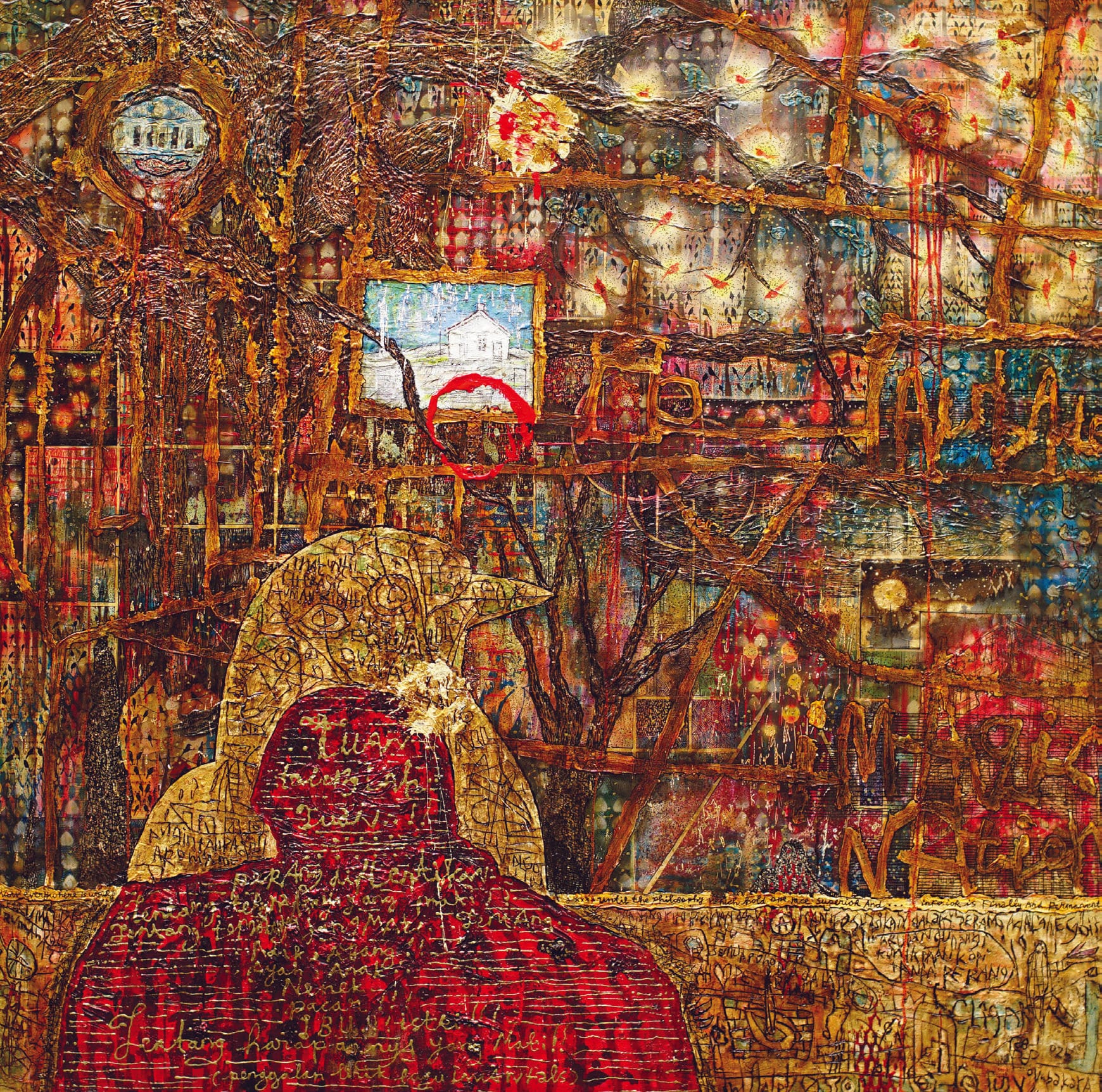 Choy Khye Fatt, 2025: 1/3 THE ABSENCE, giclee print on rice paper, 39cm x 39cm (left), Elhassan Elmuontasir, 2024: Directions, Acrylic, collage on paper, 42 cm x 60 cm