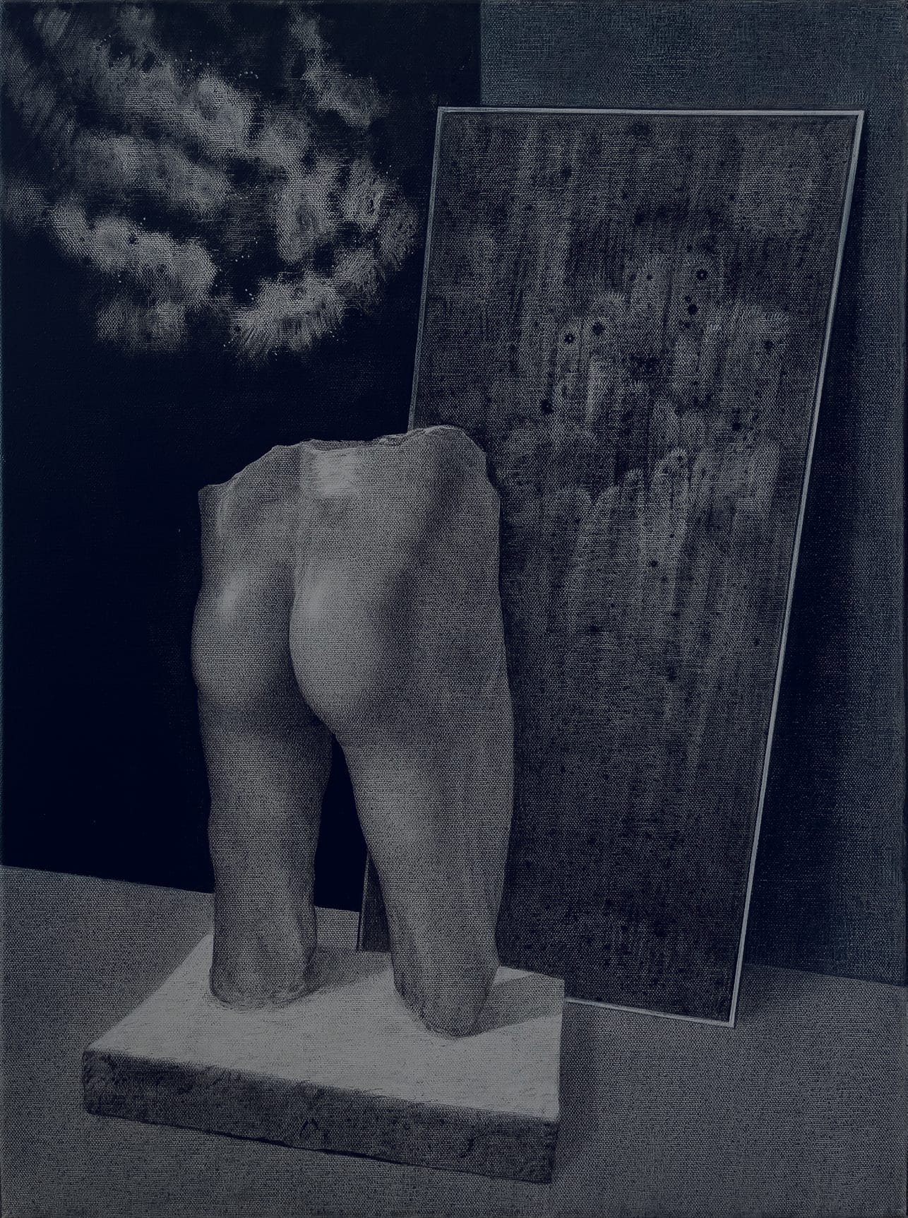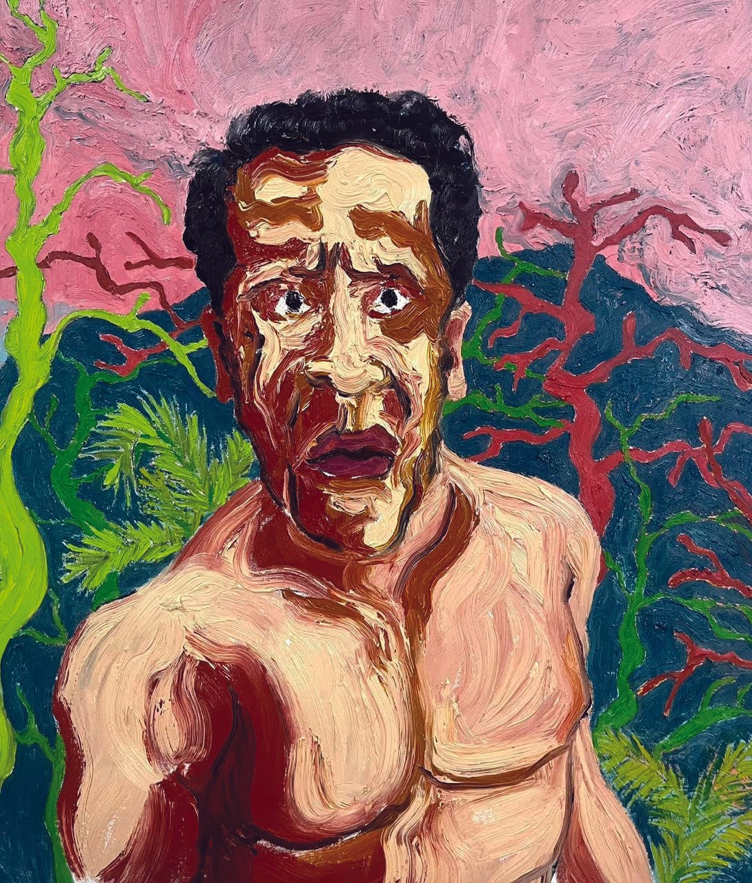 R.M Naeem, 2023: Still-Life, Acrylic on canvas, 61cm x 45.5cm (left) Sanker Ganesh, 2025: Selfie With Nature ll, oil on linen, 91cm x 107cm