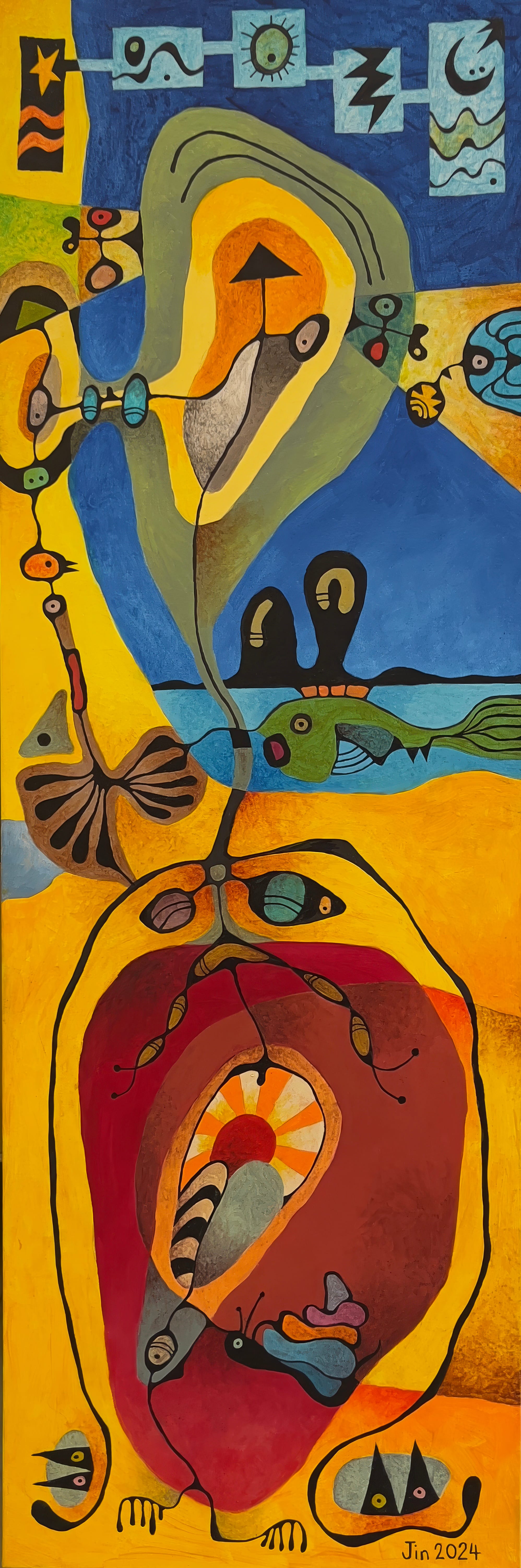 This painting marks a pause in my journey—a moment of introspection. Its meaning is fluid, likely to change as I evolve over the years. As an artist, I’m continually learning, delving deeper into myself and my work. This piece isn’t a definitive statement of my identity but a snapshot of a moment, a conversation between my changing self and nature’s rhythms.