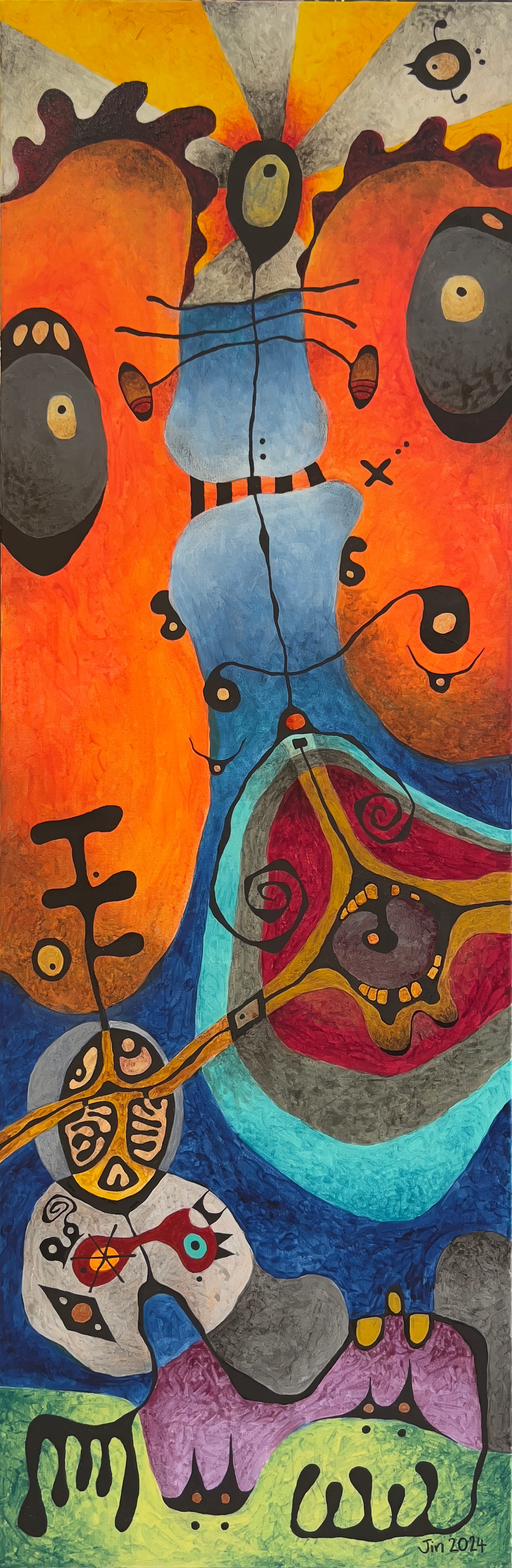 I ENJOY the whimsical. In art, it manifests as forms like the surrealist portraits in this project. There was no grand intent at the start—just a quick sketch of abstract facial features within a 1:3 rectangle on A6 paper. The next impulse: it would be a “greenish portrait within a 16 x 48-inch frame.” See Guarded Greens above. To produce it, I simply went with the flow—enjoying the process, letting colours and forms find their own rhythm. Eventually, I decided all six portraits I had done so far would feature bespectacled figures and adjusted them accordingly.