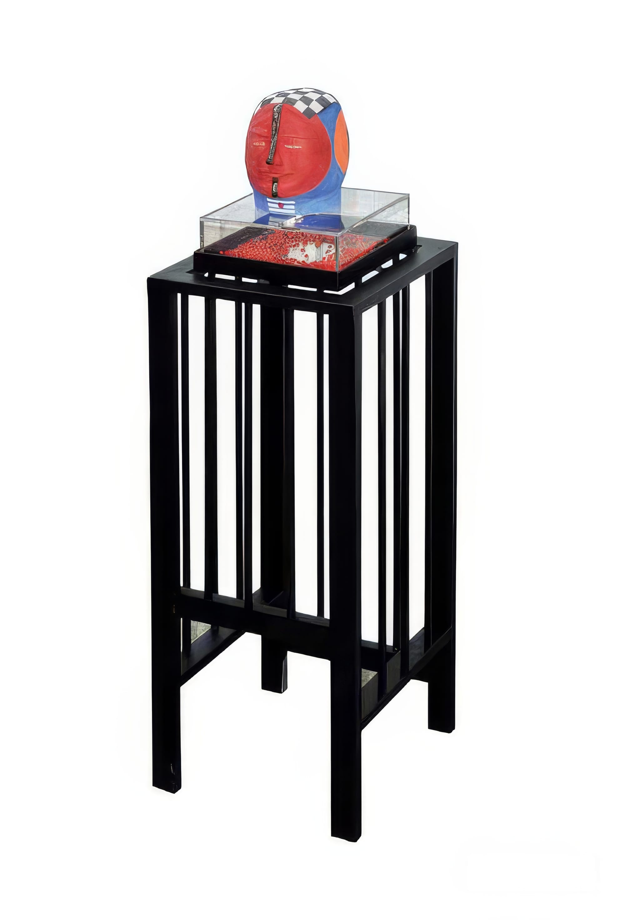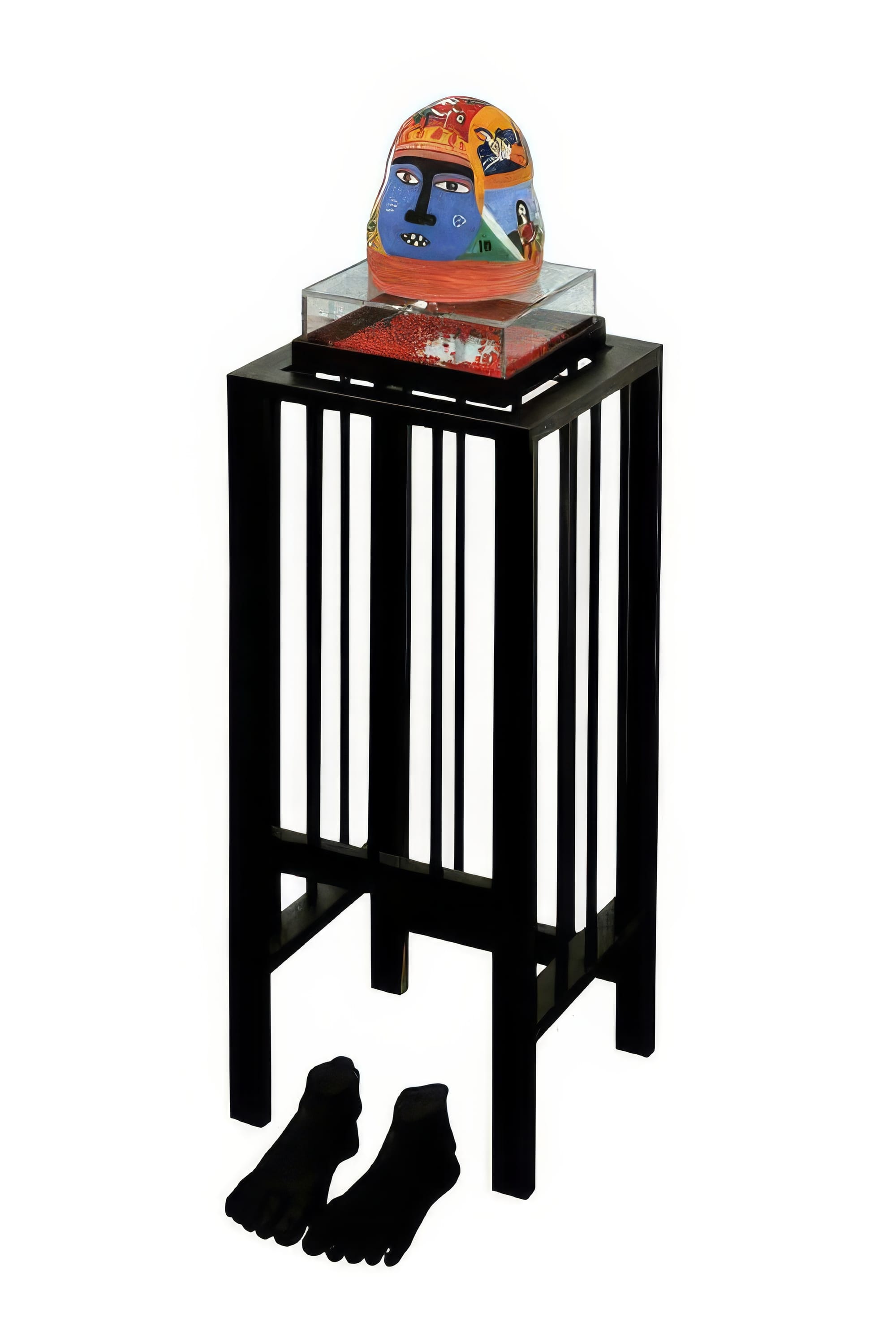 Poojitha Menon, 2024, Queen, Stoneware clay, metal, saga seeds, PLM material 3d printed foot, acrylic box, Dimensions variable; Joker, Stoneware clay, metal, saga seeds, acrylic box, Dimensions variable