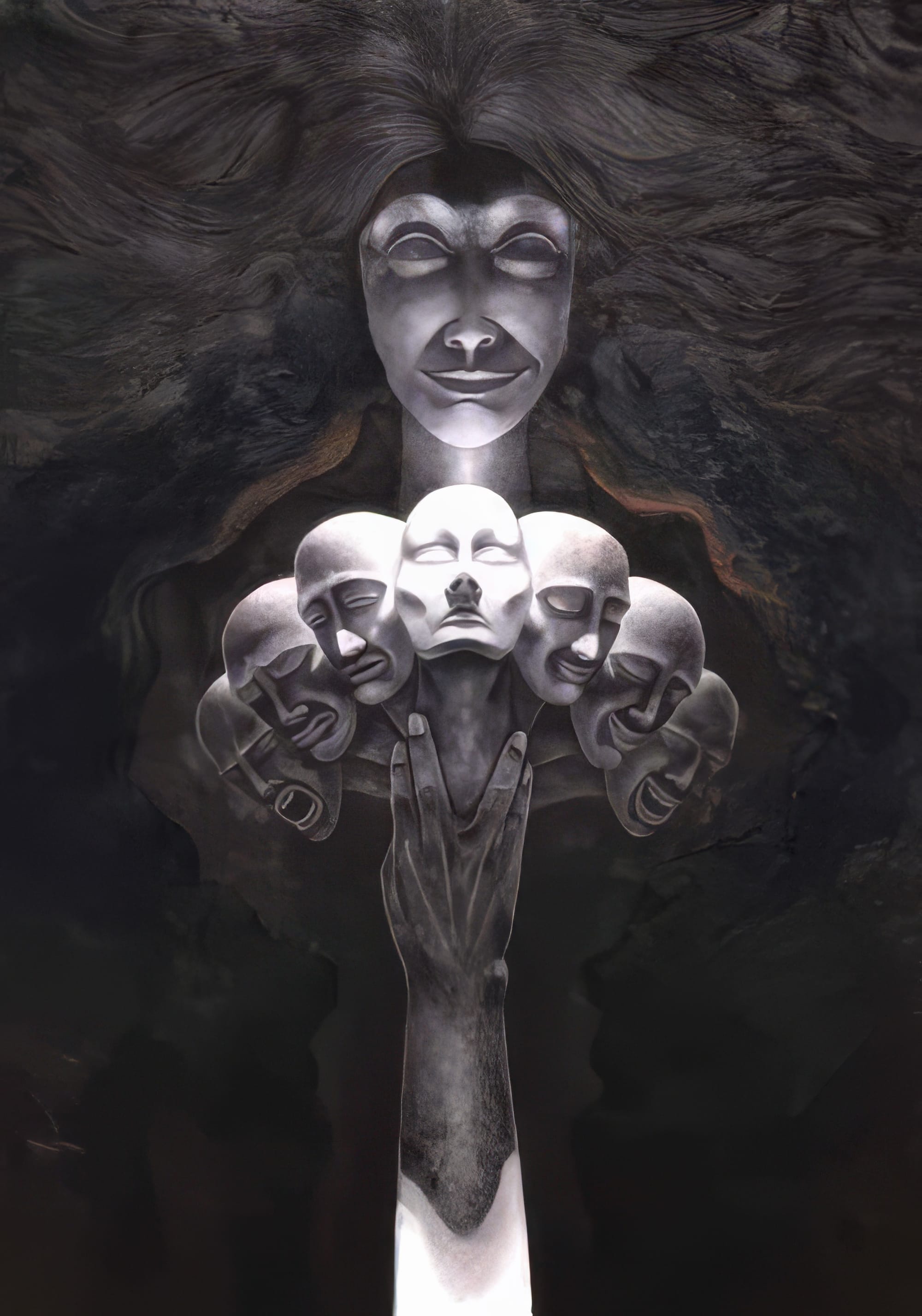 Plays of Creation: The feminine powers of the universe create the plays of life. The darkness of the universe is merely the extension of her grace & beauty. Like her puppets we feel from despair to ecstasy at her whim. Only self determination is the path towards illumination and beyond her control. As an artist, this work is the manifestation of my spiritual journey that came from my observations of life and human behaviour.