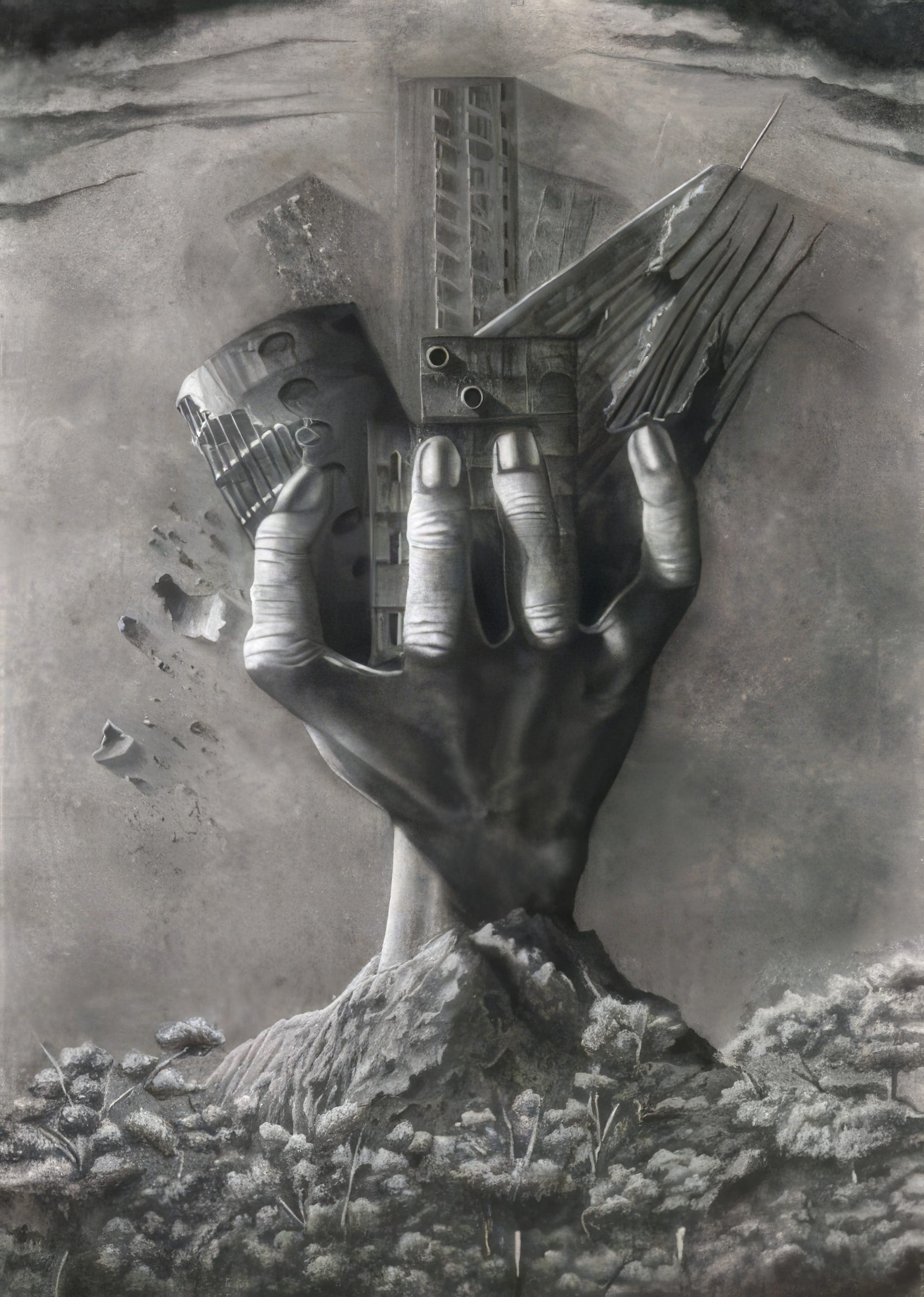 Deracination: We establish ourselves as merely an extension of nature. However in time, the ambitions of man grows and our ties to the planet is forgotten. We will grow beyond control and end up breaking. Such is the fate of the loss of our connection to the rest of creation. Mastry was a means to convey this warning, expressed with the brutalist architectural style and the liberal use of charcoal with plays of light and dark. The centrality of the hand creates the point of contemplation.