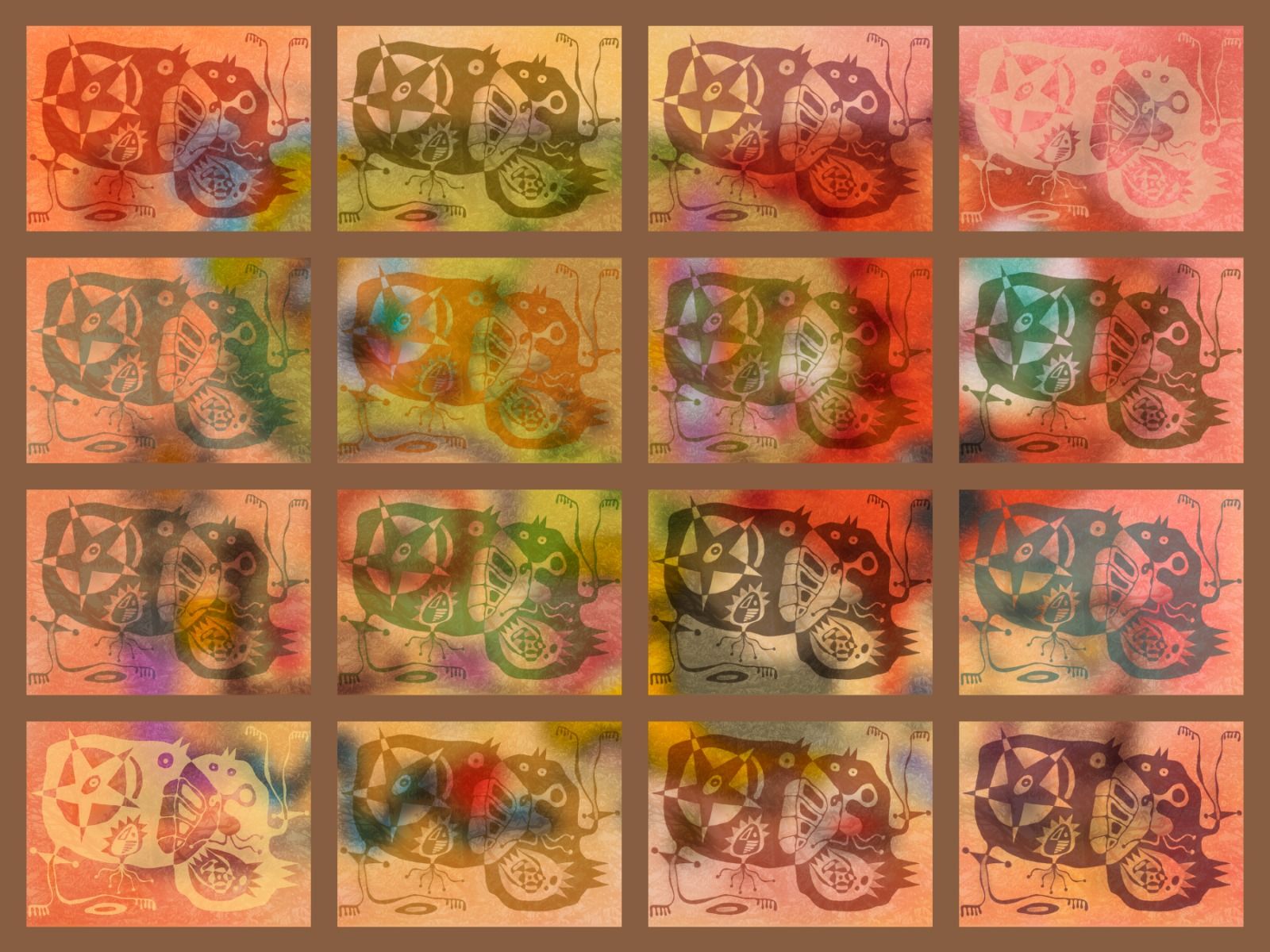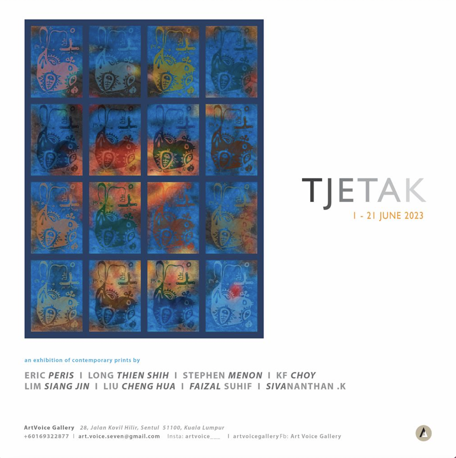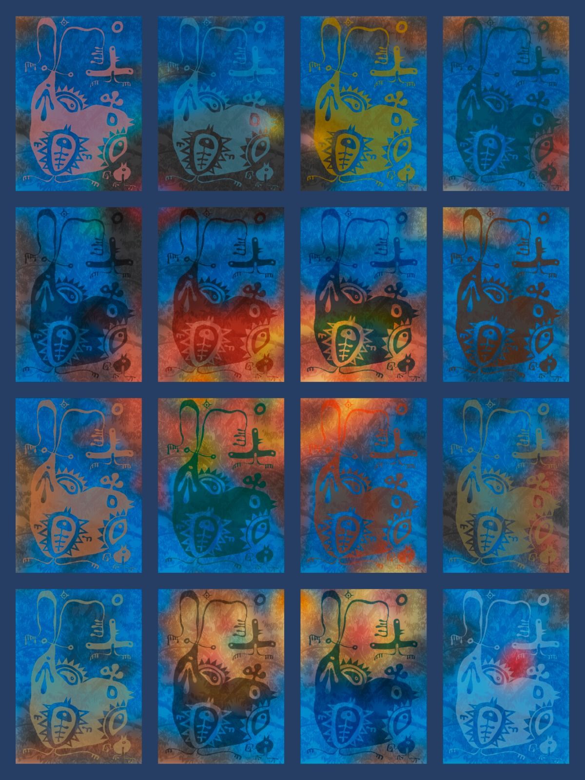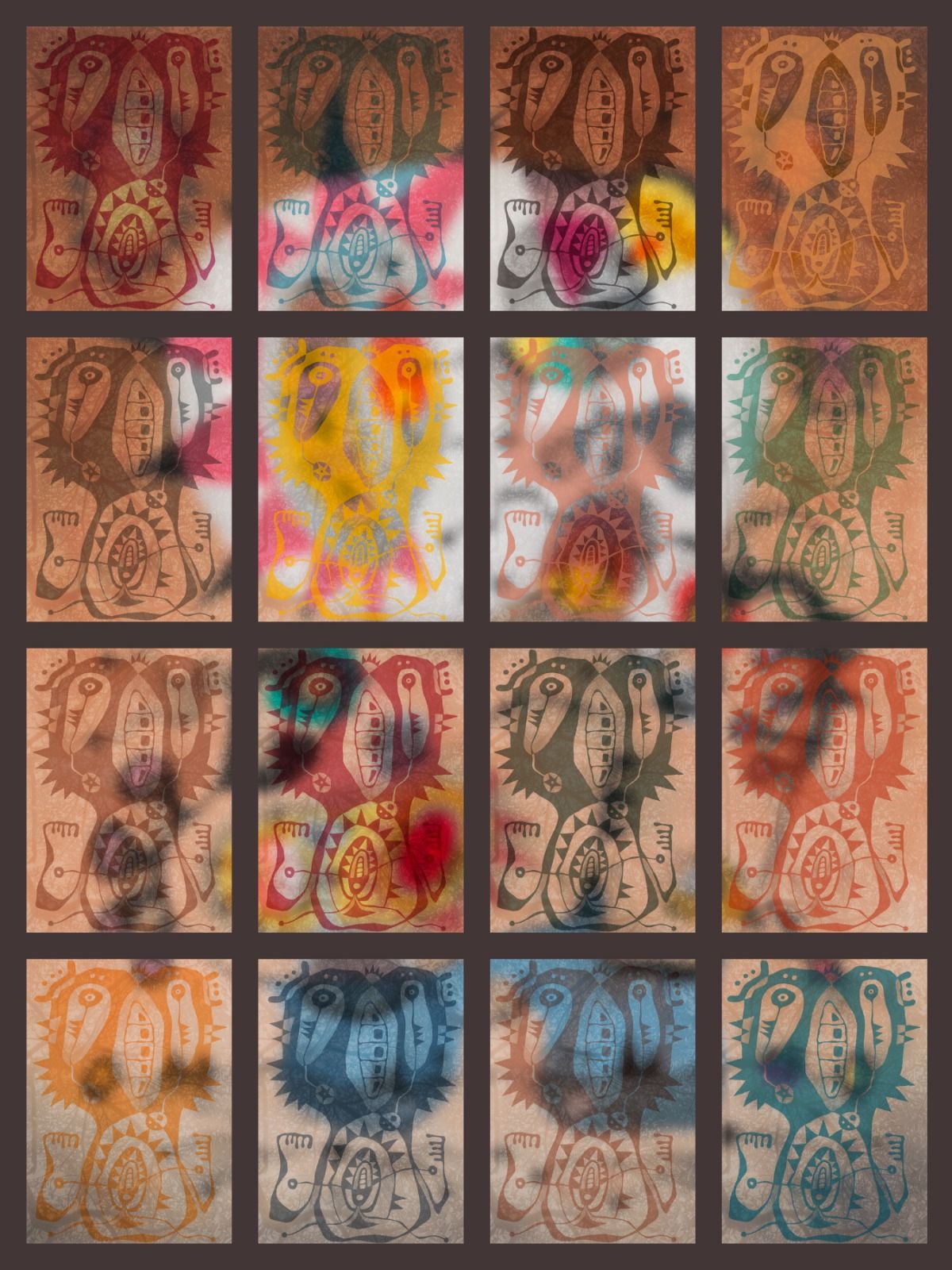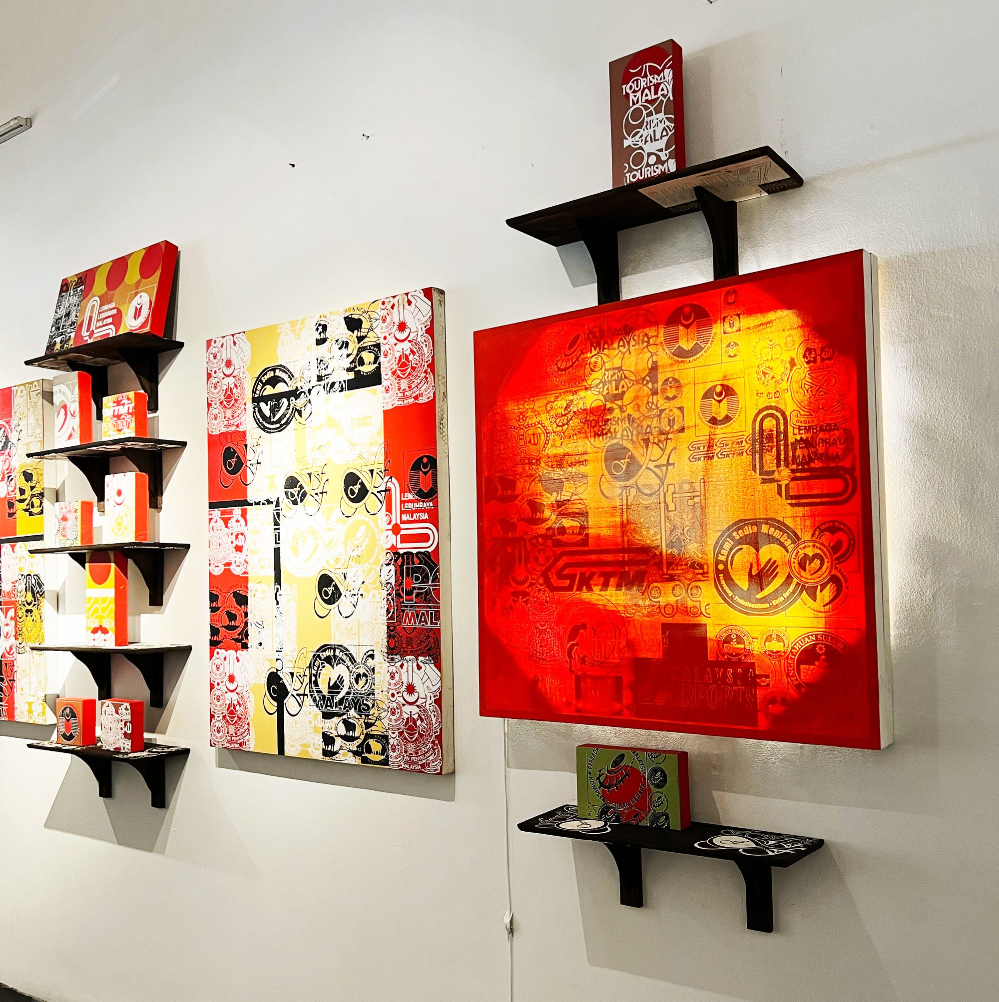 The print is divided into 16 small rectangles. In each of them is placed a “Durian Antic” and a photo of the tree canopy. Each rectangle is enriched further using colours from my painting. The resultant rectangles are placed together to form a Warhol-like piece. The digital files for printing have been vectorised, which means the prints can be very big, as big as any printer can do. In Malaysia the largest printer can do 25ft wide.