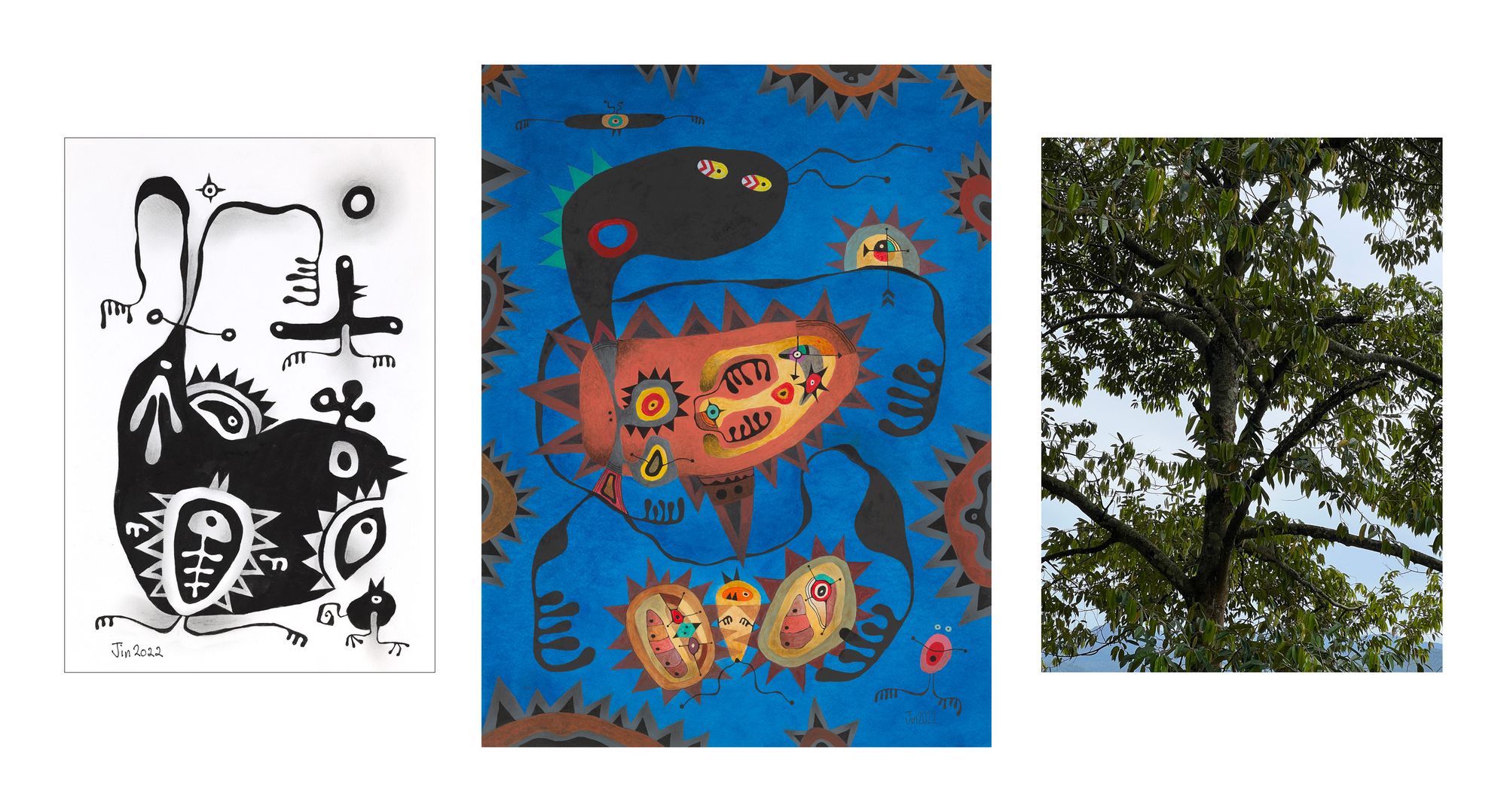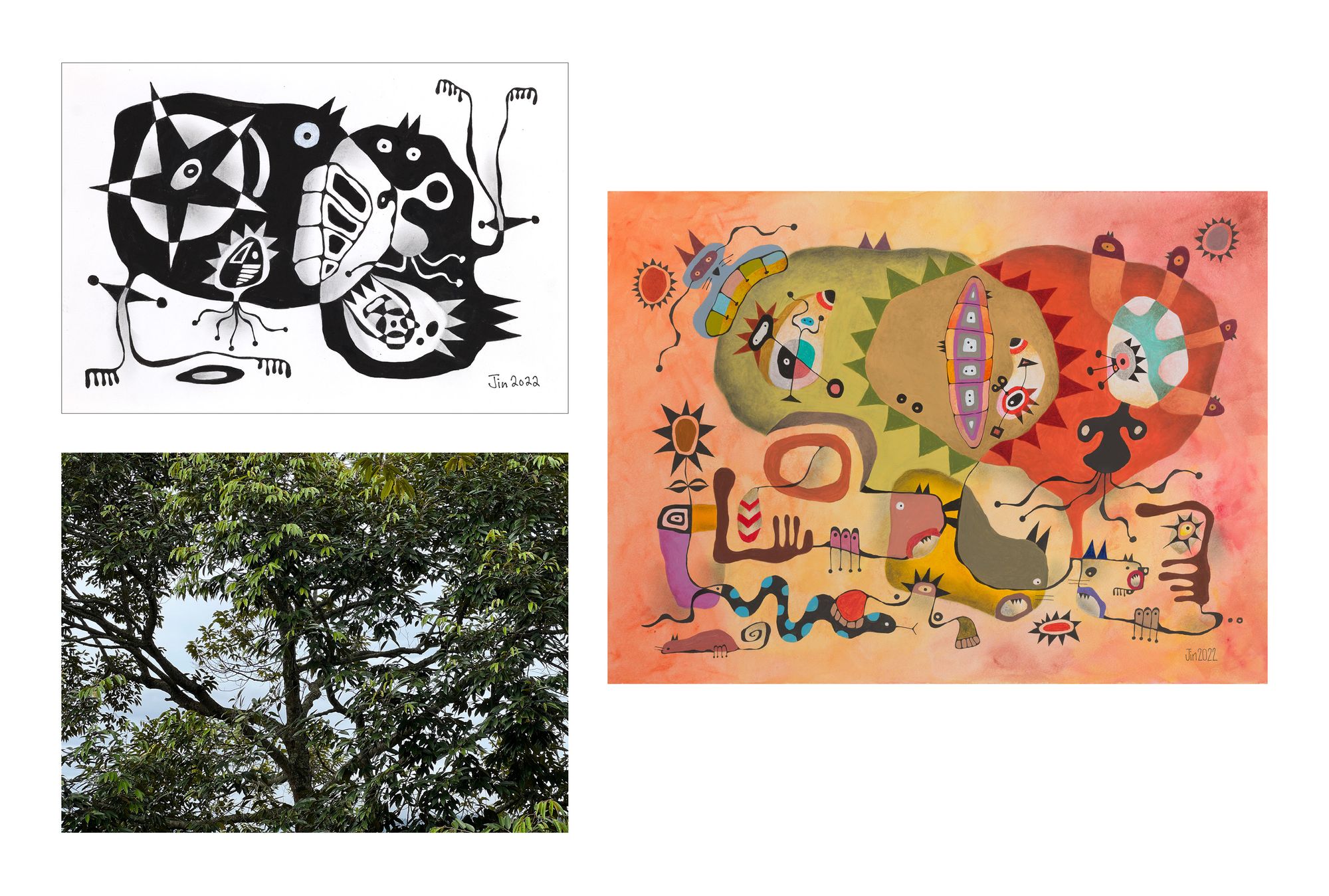 A word on my “digital-analog” work on “Durian”: Each piece comprises (1) an original painting 30in x 23in in size as background, (2) one of 12 B&W mini paintings derived from doodles; I called them “Durian Antics” and (3) photos of durian tree canopies I took at the Awanbulan Resort in Negeri Sembilan early this year.