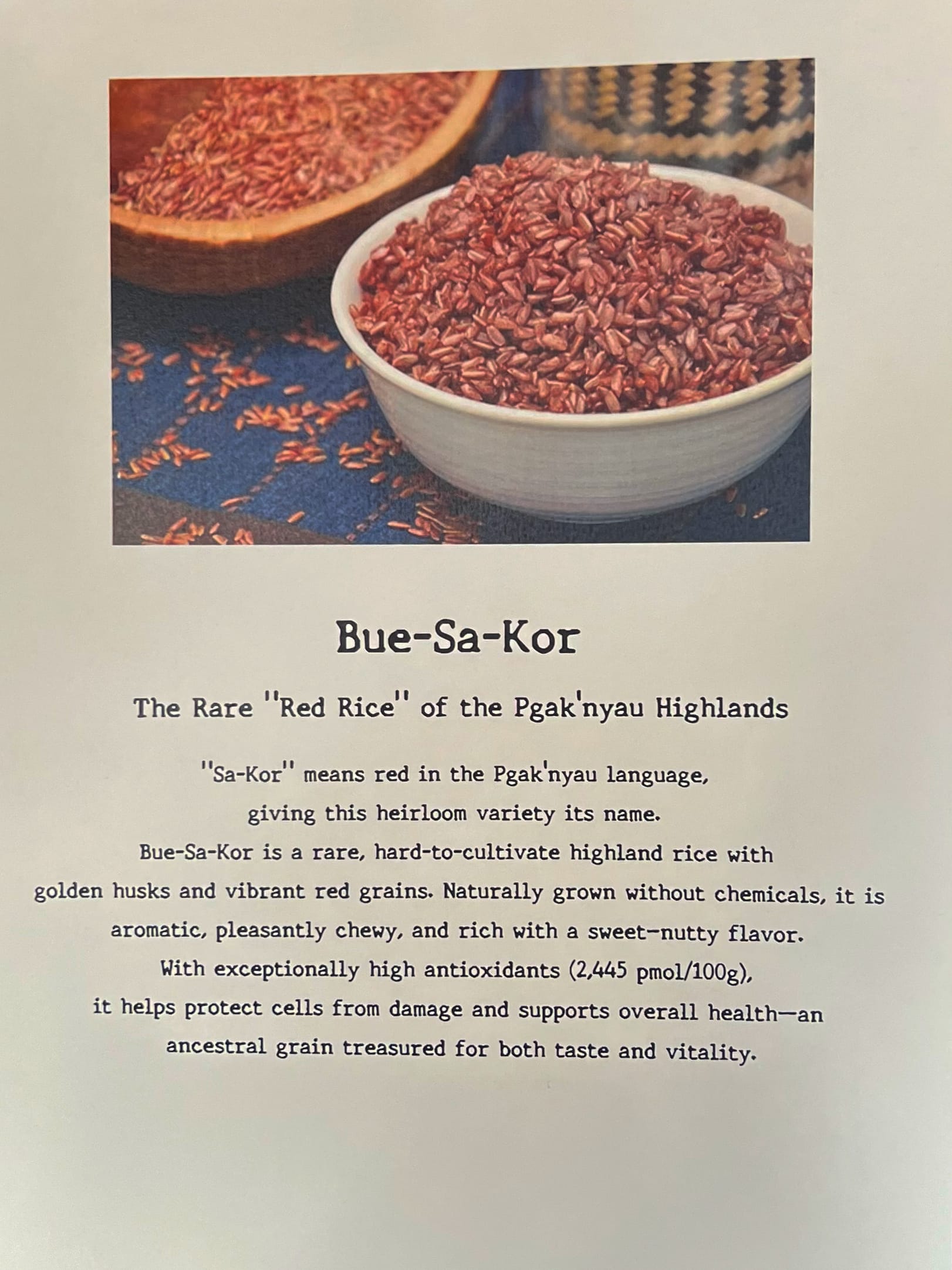 - Another rare bue-sa-kor red rice from the Pgak’nyau highlands is relatively complex and chewy. The highlands refer to the mountainous regions of northern Thailand inhabited by the Pgak’nyau people (also known as Sgaw Karen).