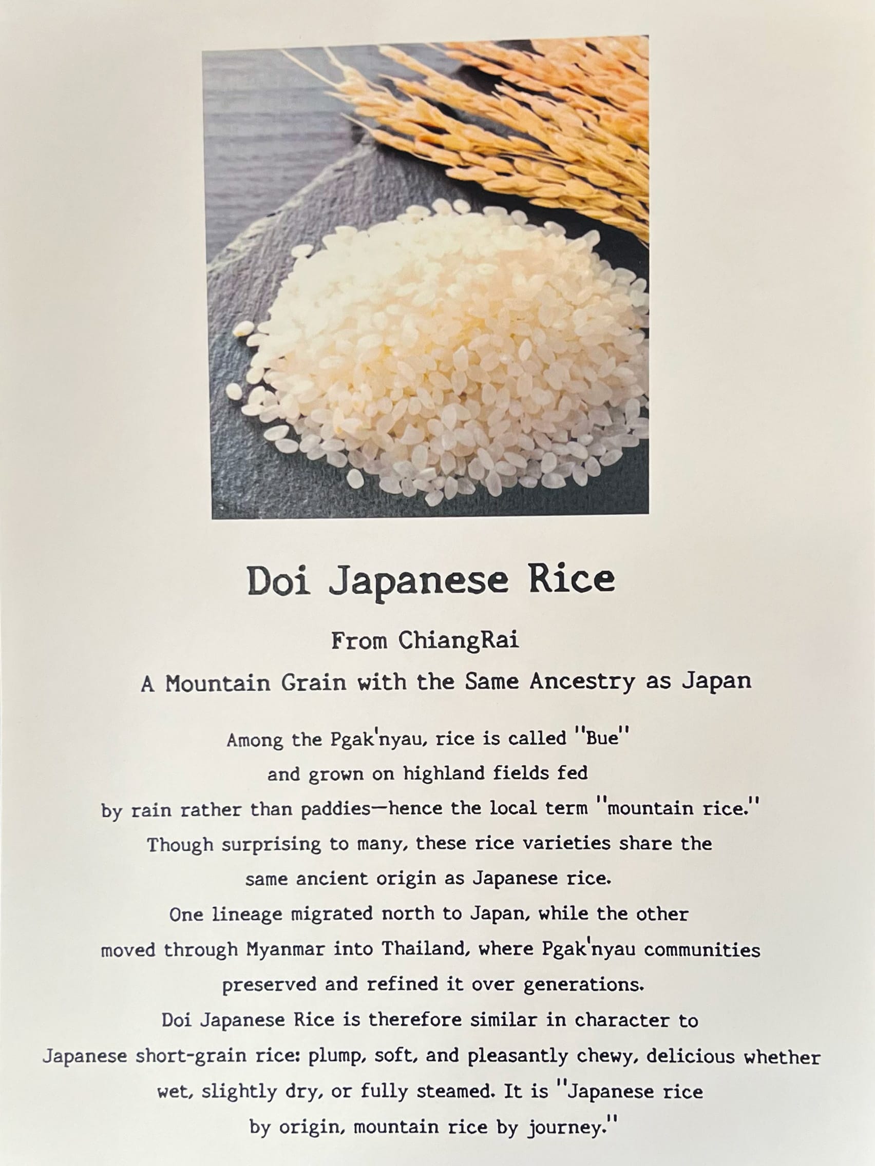 - The doi rice, a mountain grain from Chiang Rai, has the same ancestry as the Japanese variety. It provides a soft texture.