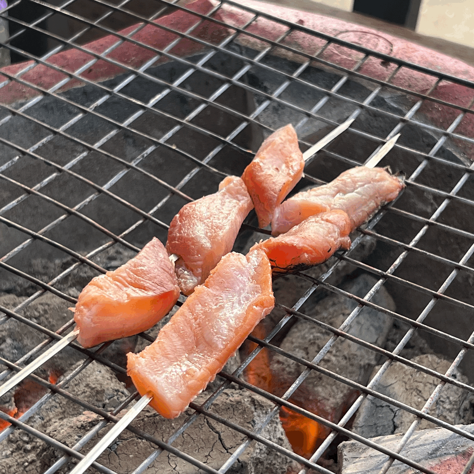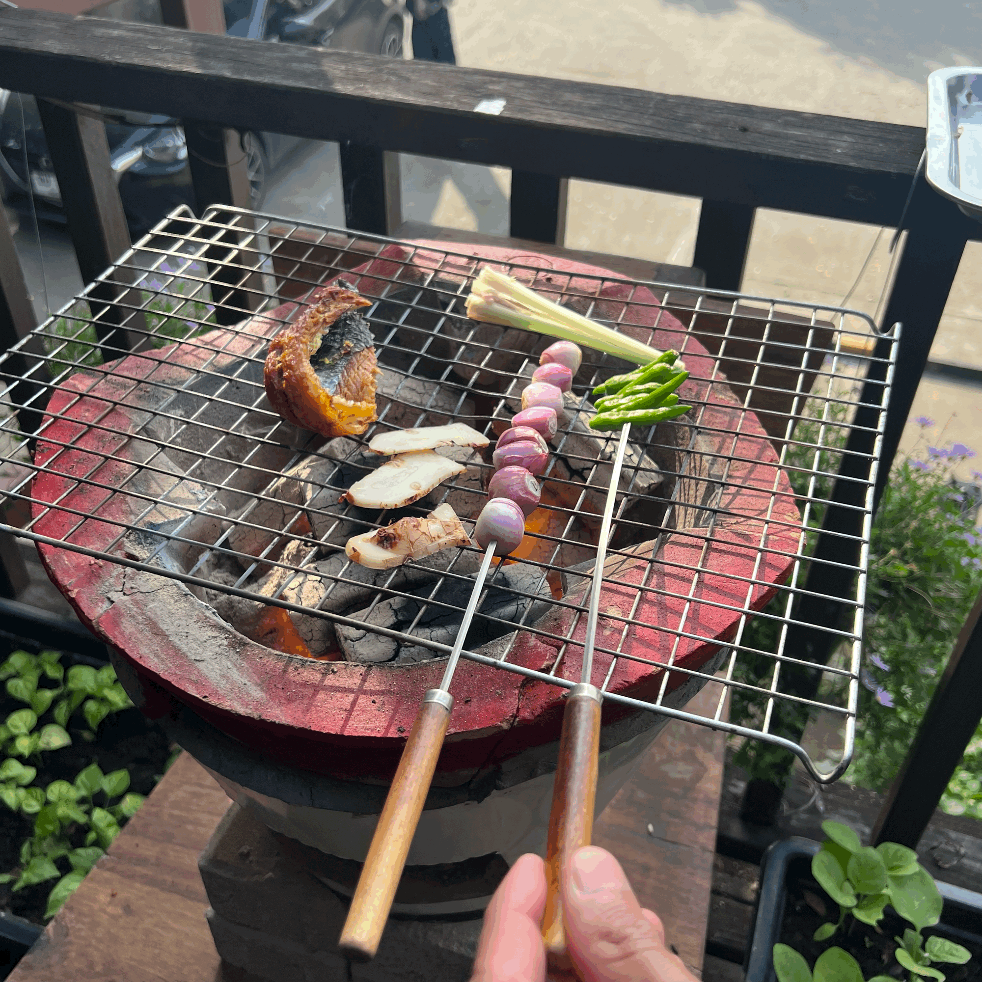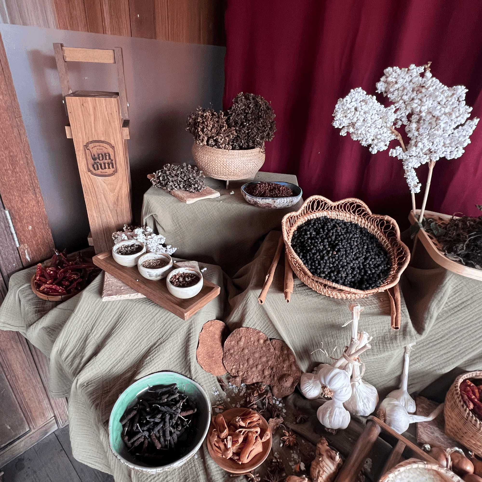 To bring out the complex flavours and aromas of the soup’s ingredients, Chef Eak grilled them first. The fish released its distinct oil scent, the shallots their sweetness, and the galangal and lemongrass their scents. After bringing all these to a boil in a pot, hor tee la and ba-geu-eur were added to enhance the umami and sour flavours. For saltiness, locally-sourced mountain salt (naan) was added, lending mineral depth that subtly enhances the dish’s natural flavours.