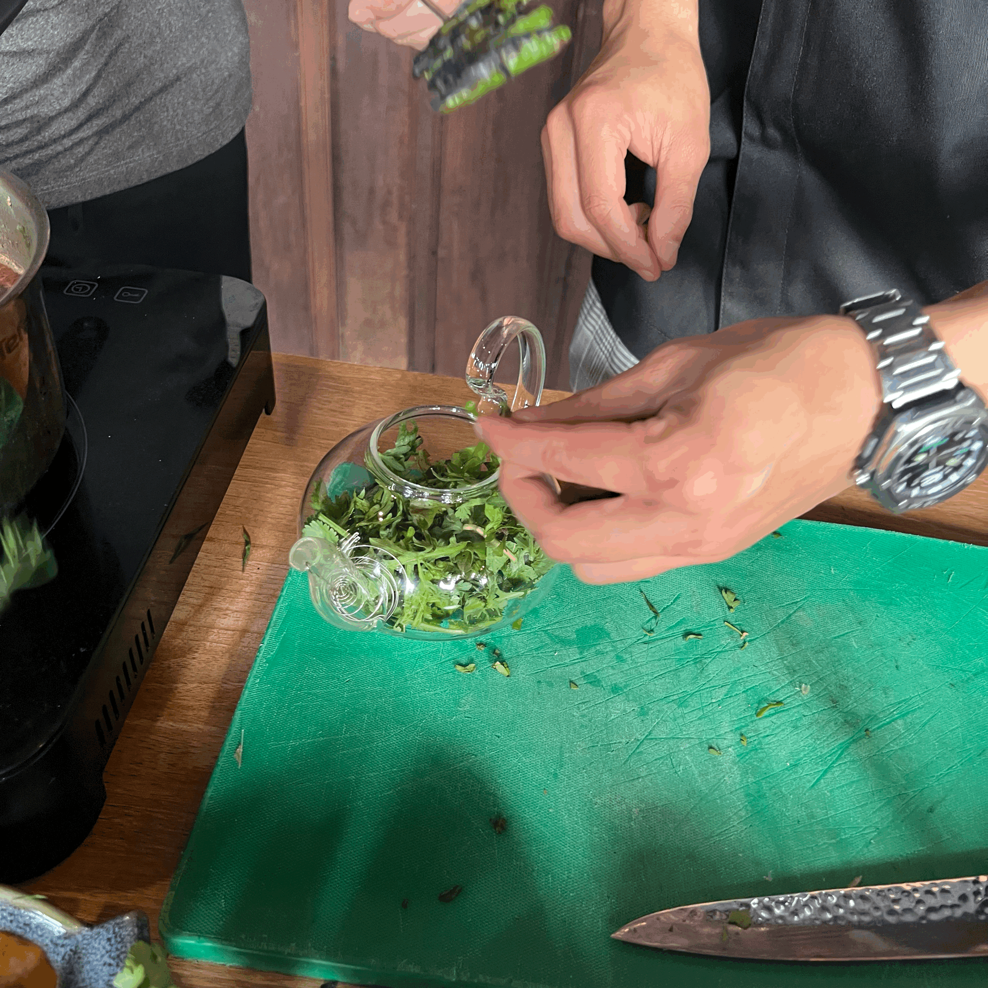 Finally, just before serving, the soup was poured into a teapot filled with the grilled bird’s eye chilli and fresh herbs—dill, coriander, and various basil—to infuse it with heat and bright, green, and lively flavours.