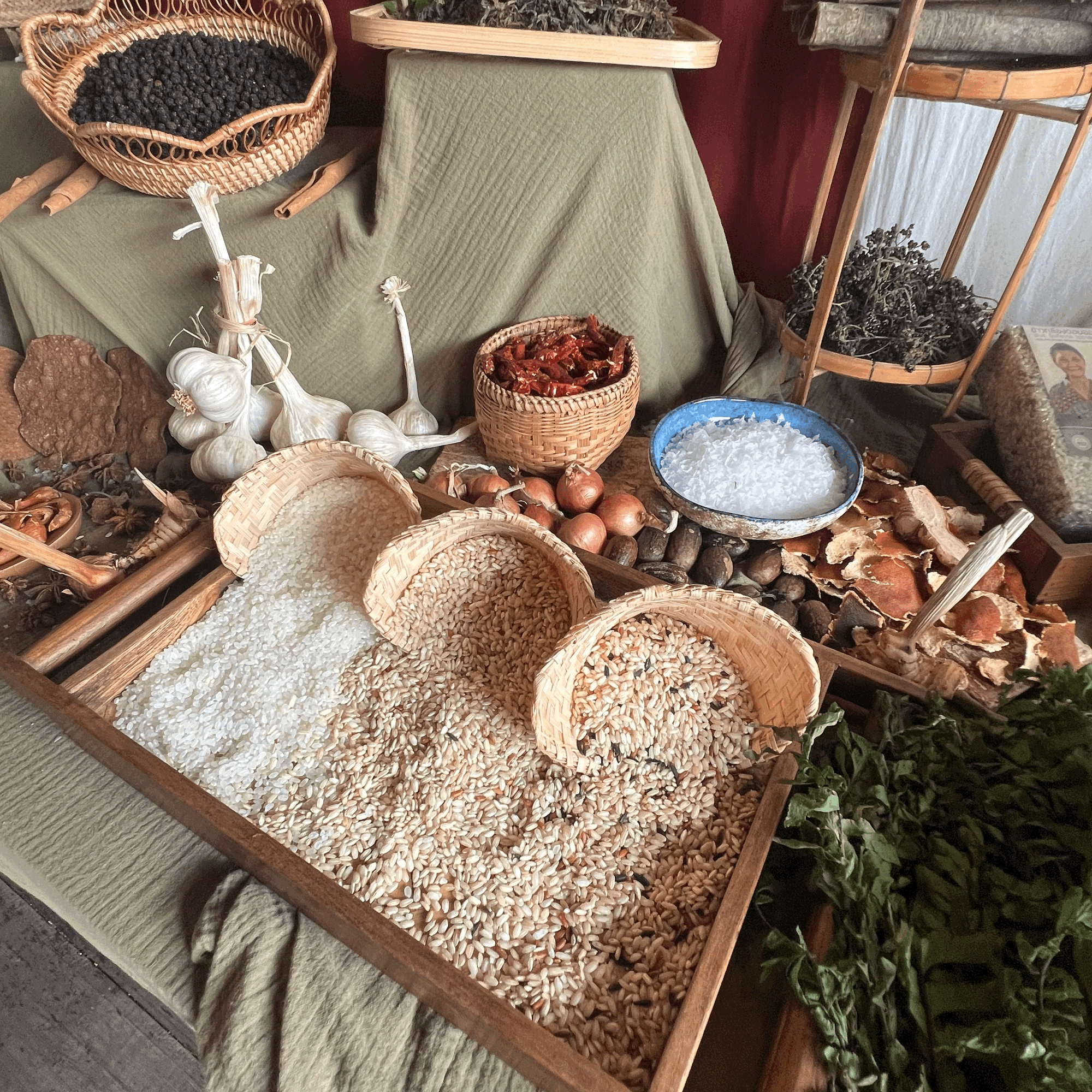 Roasted red rice tea (top left), Southern Thai dessert ka nhom kee mun (top centre) and the variety of spices and other flavour-enhancers used