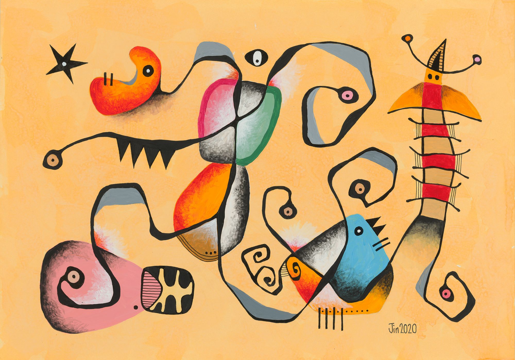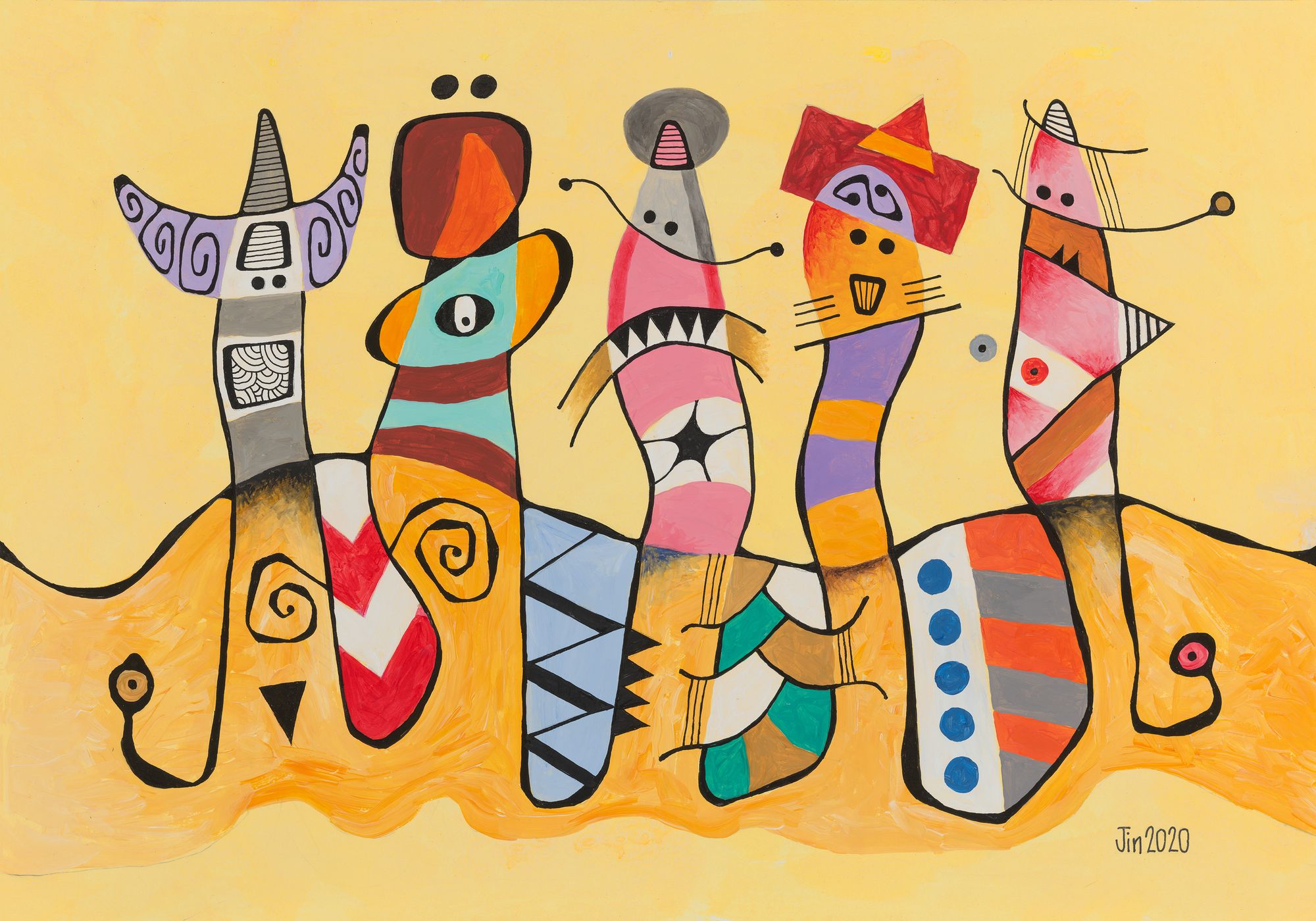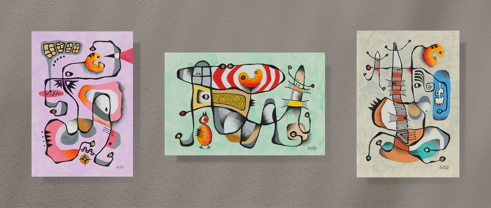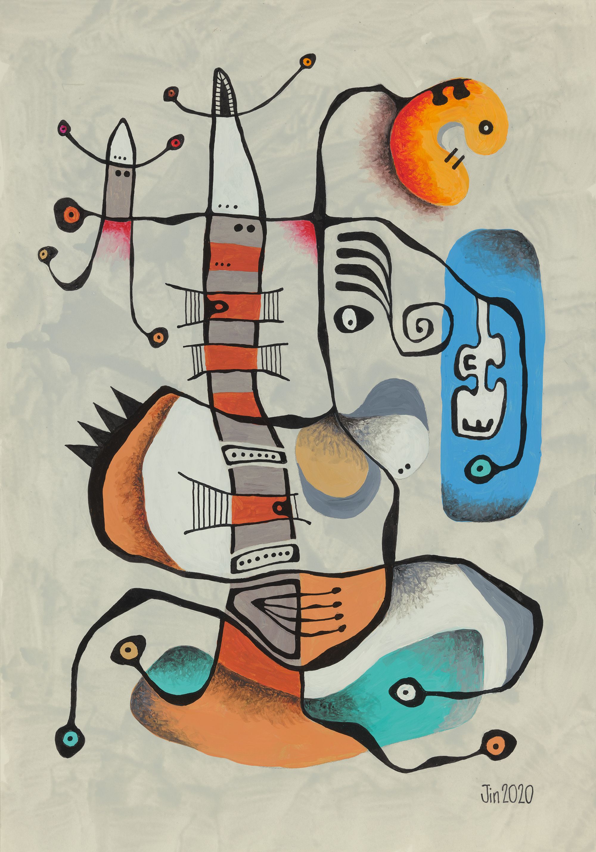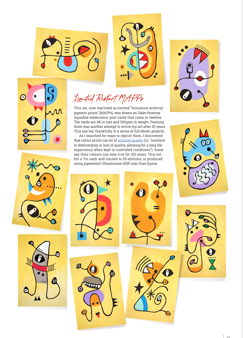 My mini series of 12 post cards took me on to do 10 bigger pieces, all acrylic and drawing ink on paper, about 20in H and 14in W. Displayed in a booklet (click here to download), they represent my attempt at continuation from my works of 1981. They of course also represent change. The 1989-2020 hiatus from art was not my only one. From 1982 to 1987, I also took a break because of work and family commitments.