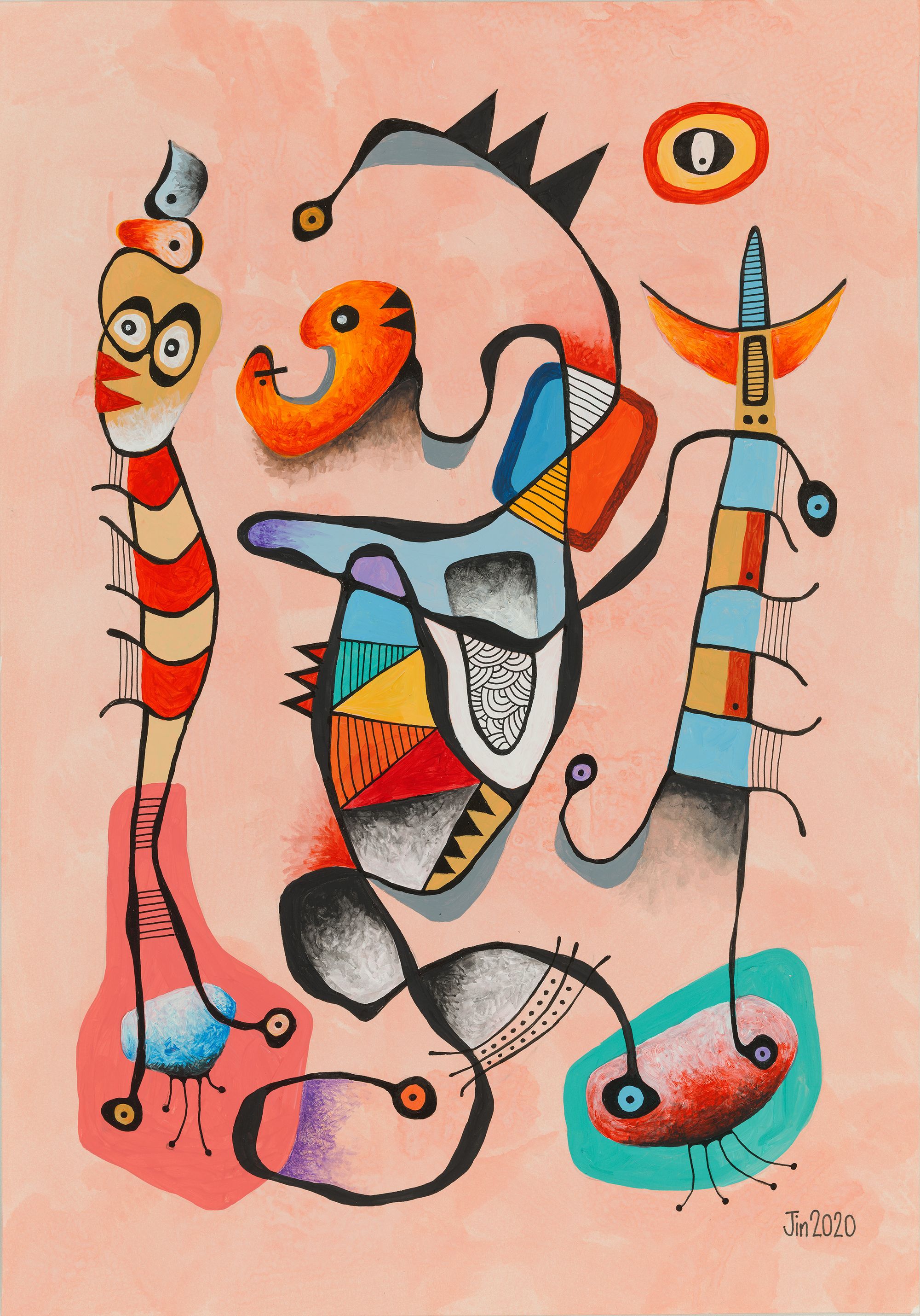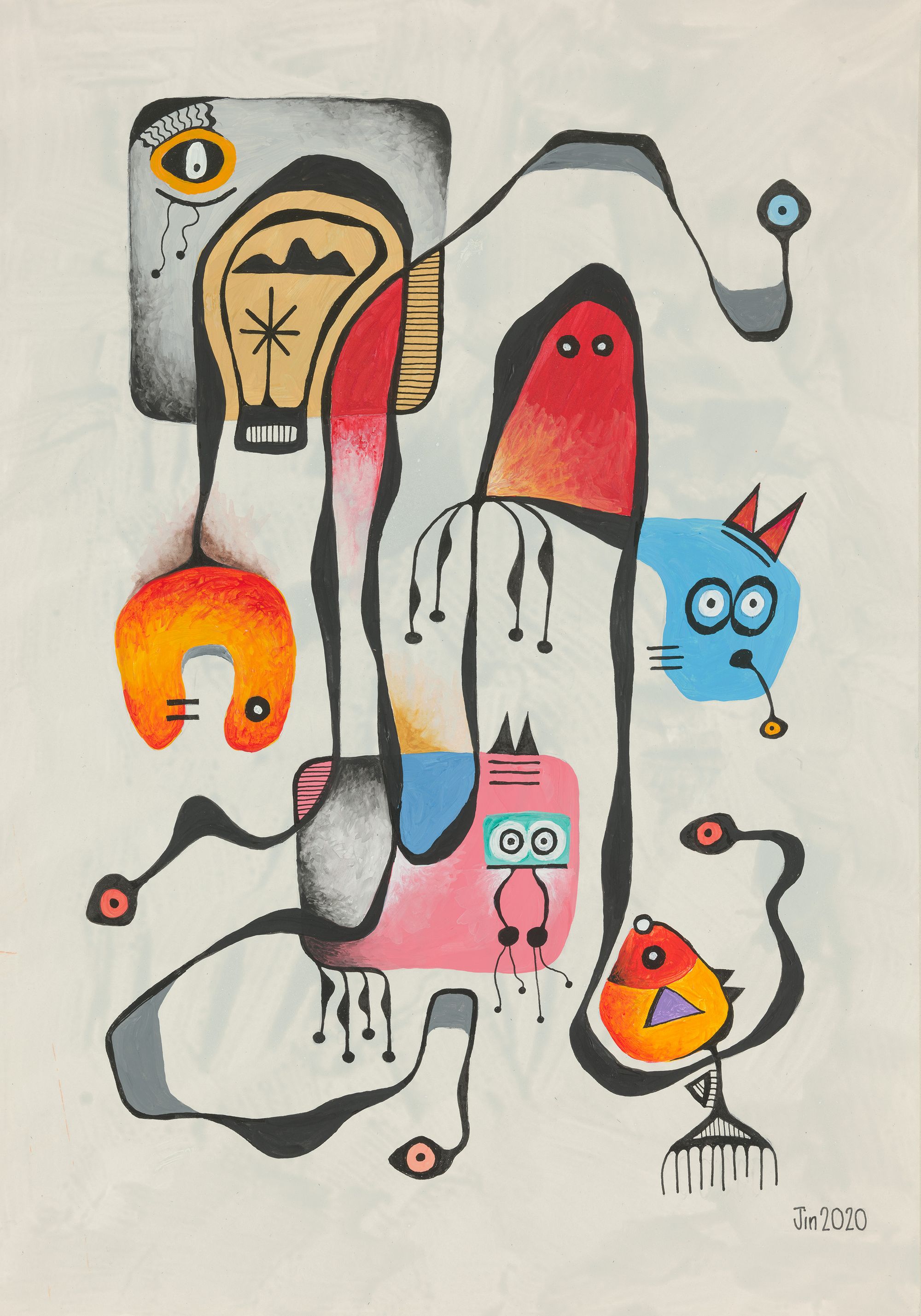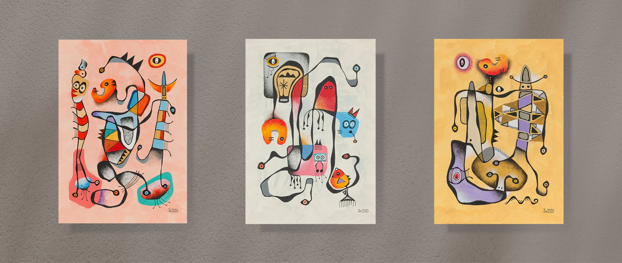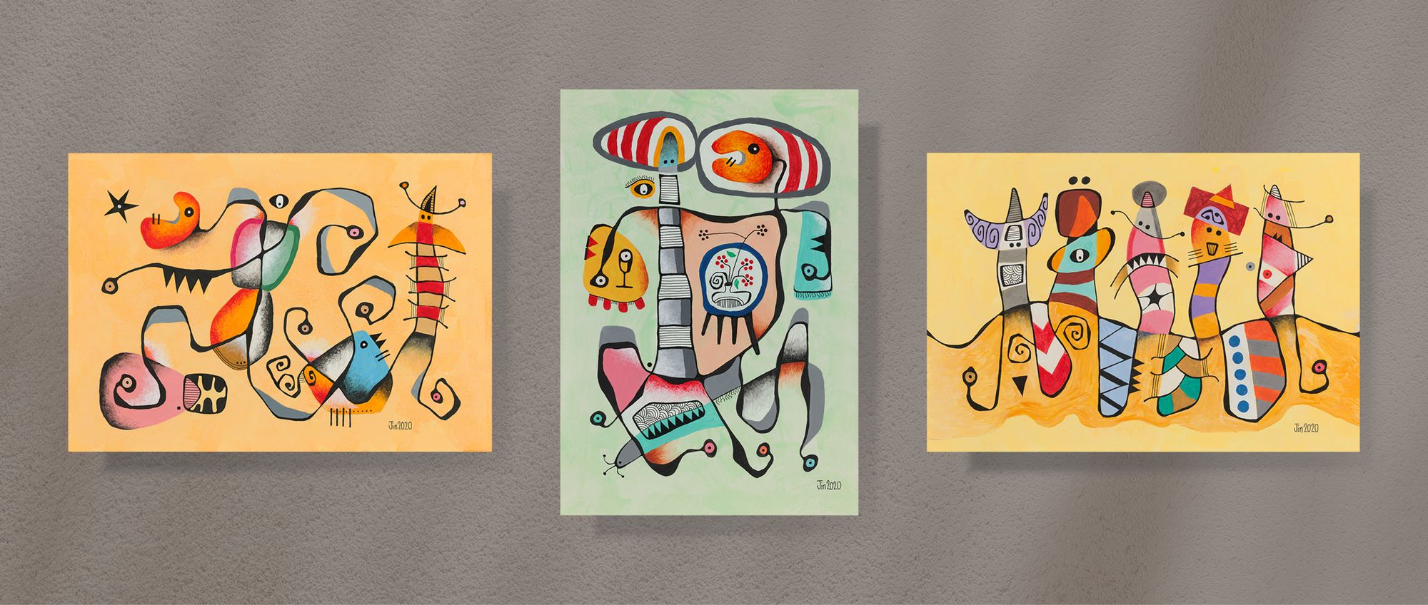 My mini series of 12 post cards took me on to do 10 bigger pieces, all acrylic and drawing ink on paper, about 20in H and 14in W. Displayed in a booklet (click here to download), they represent my attempt at continuation from my works of 1981. They of course also represent change. The 1989-2020 hiatus from art was not my only one. From 1982 to 1987, I also took a break because of work and family commitments.