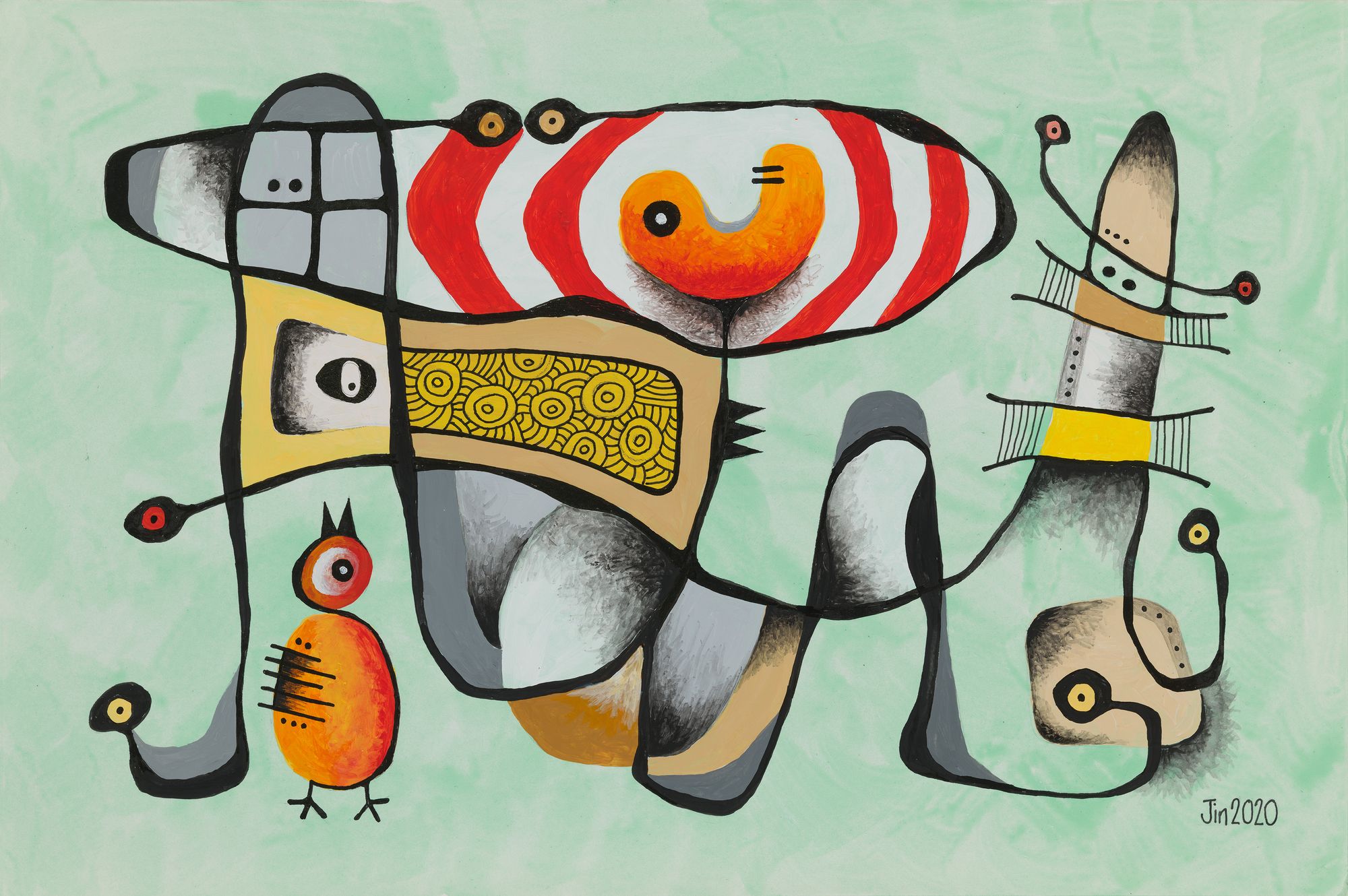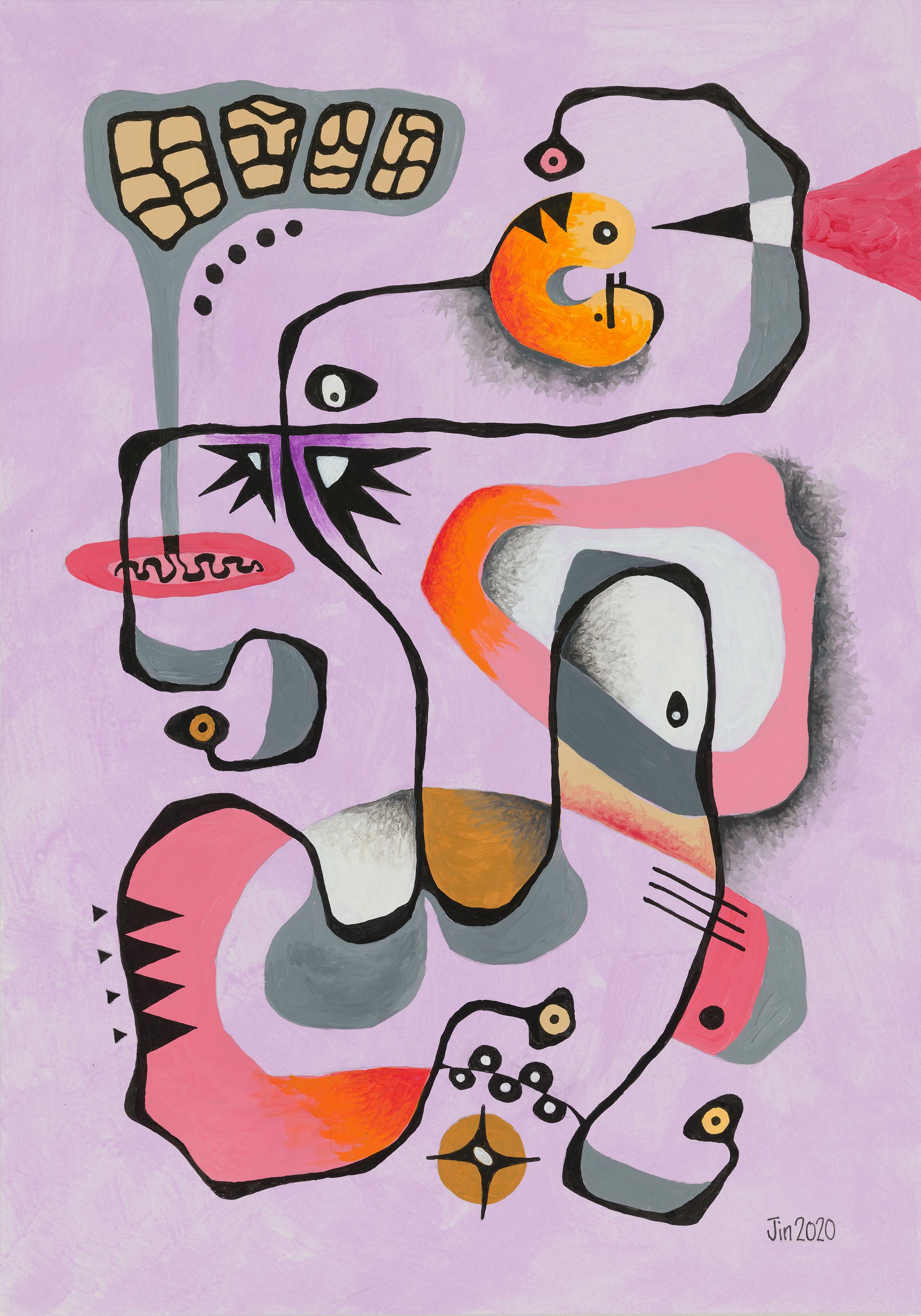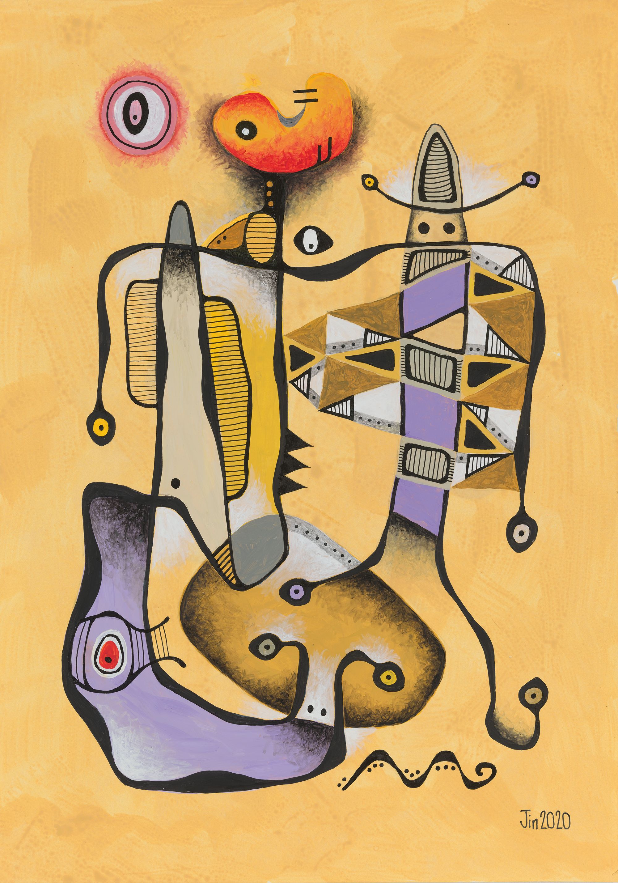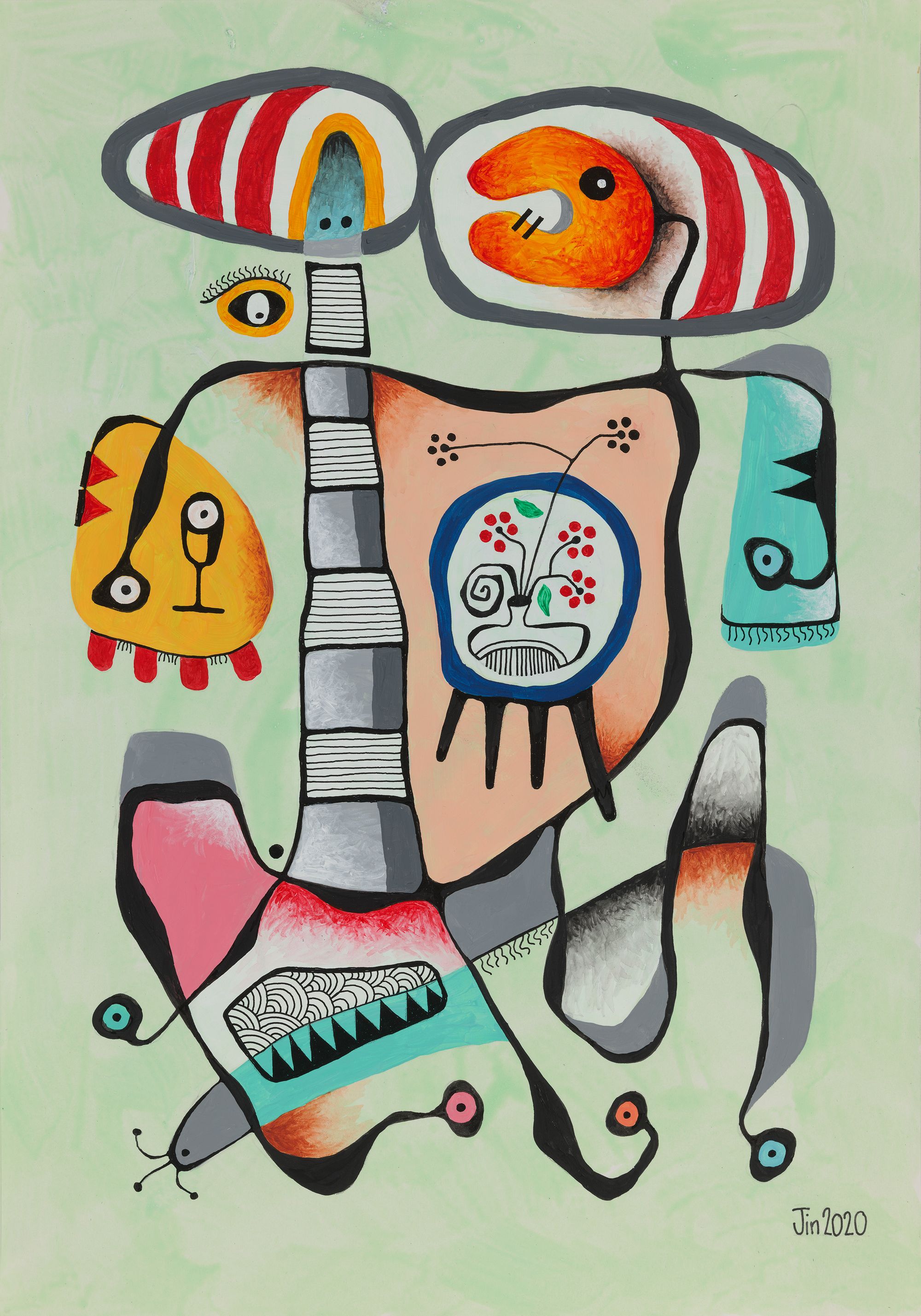 My mini series of 12 post cards took me on to do 10 bigger pieces, all acrylic and drawing ink on paper, about 20in H and 14in W. Displayed in a booklet (click here to download), they represent my attempt at continuation from my works of 1981. They of course also represent change. The 1989-2020 hiatus from art was not my only one. From 1982 to 1987, I also took a break because of work and family commitments.