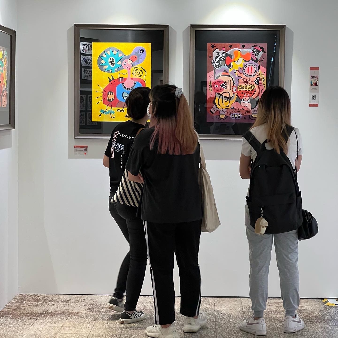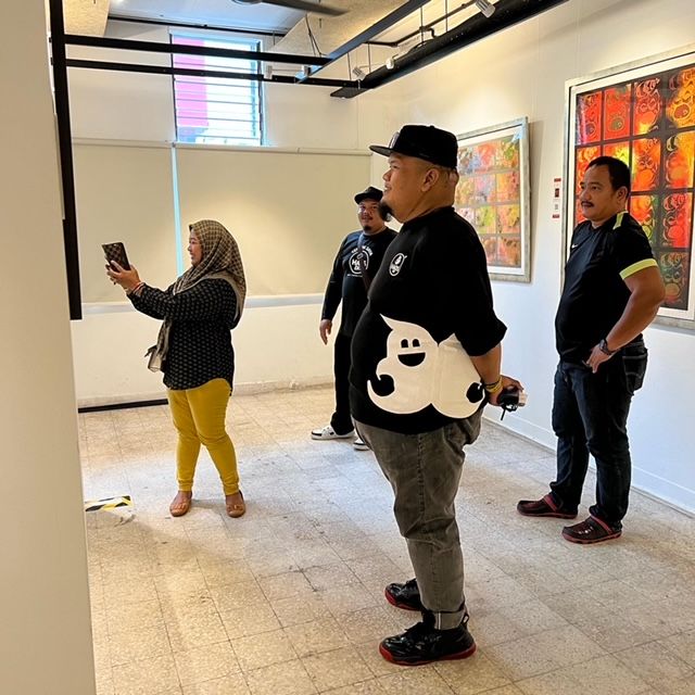 Staff from WL Framing arrived punctually at 9.30am and brought along the bigger pieces from their shop. After arranging all the pieces on the floor and finalising the spaces between the paintings, they started to put them up. Paintings placed on concrete walls were suspended using nylon strings and hooks.