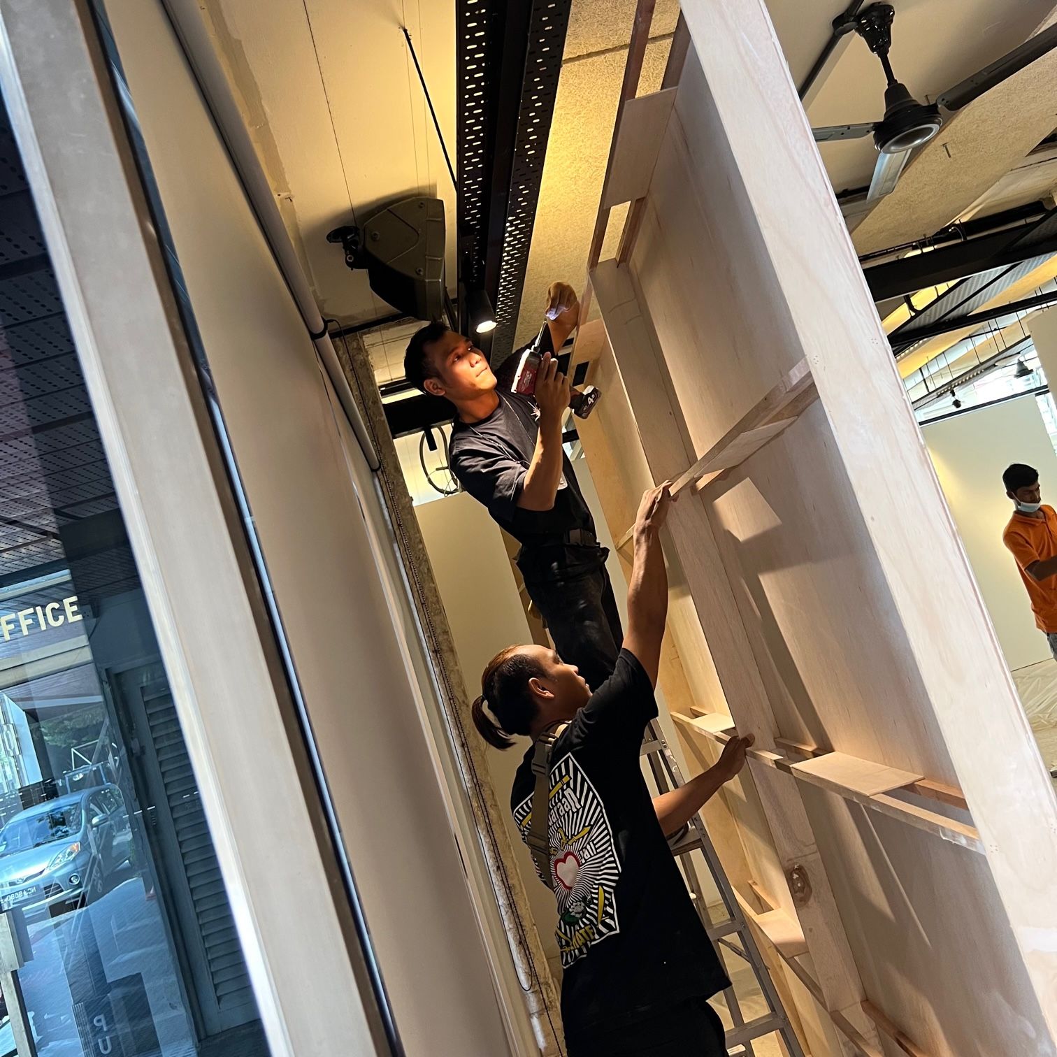 The drywalls have been installed. They started at 9.30am sharp and finished around 4pm. I am glad. They look good — shaping up like a “real” exhibition hall.