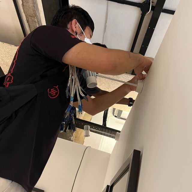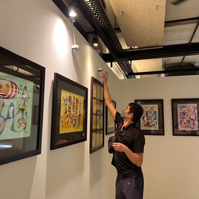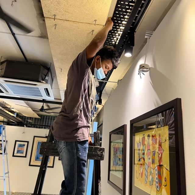 Lights were put up after the paintings went up, to ensure they were positioned right above each painting and shone down at the right angle. When the gallery was lit up, the ambience of the place transformed. It began to look like a professional venue for the display of art.
