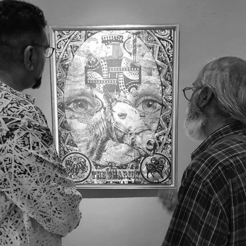 Thanaselvam, 2026: Kuda sembrani, mixed media on canvas, 61 cm x 61 cm; Thineswari G, 2026: 1/6 Gopal, digital artprint on canvas, 61 cm x 61 cm