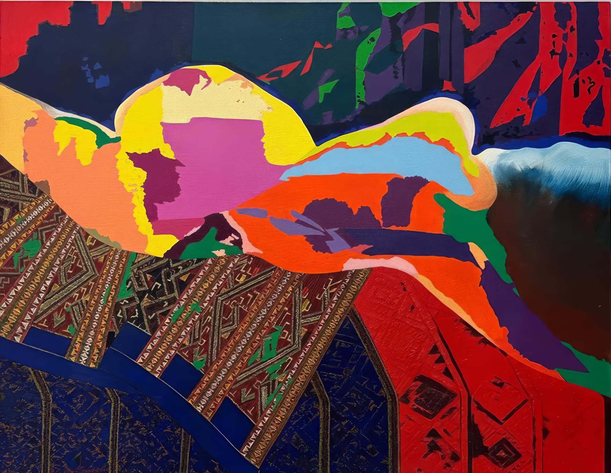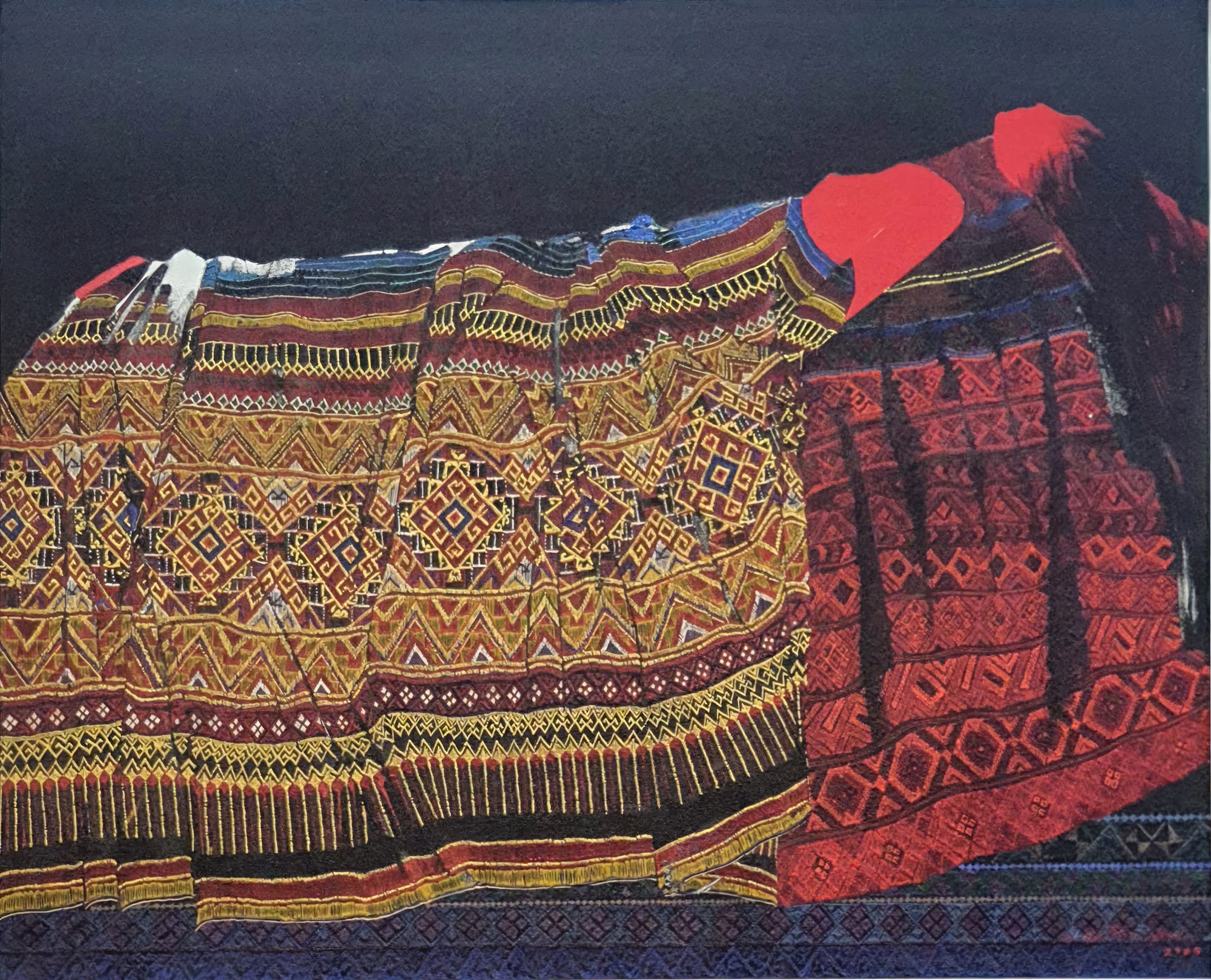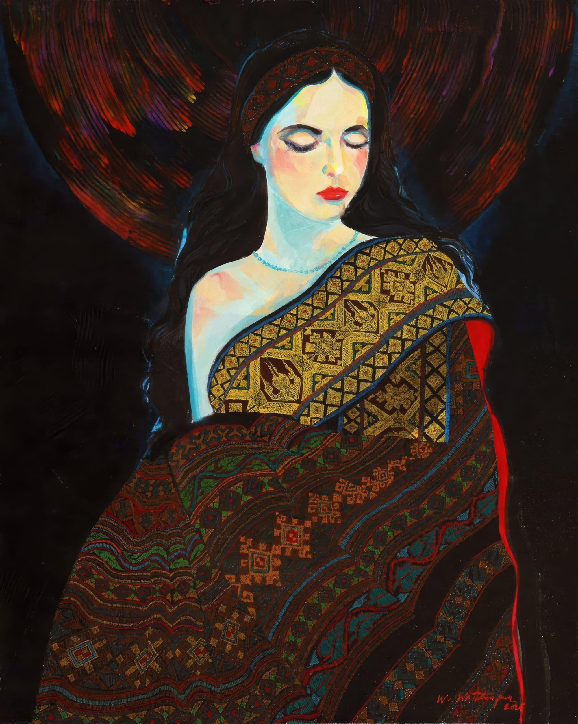 In the painting, a woman is wrapped in detailed patterns that glow with gold, red, and deep earth tones. Only faint traces of her body and face can be seen. The viewer is left to wonder: is she sleeping, unwell, dying, or already gone? This uncertainty adds to the emotional tension of the piece.