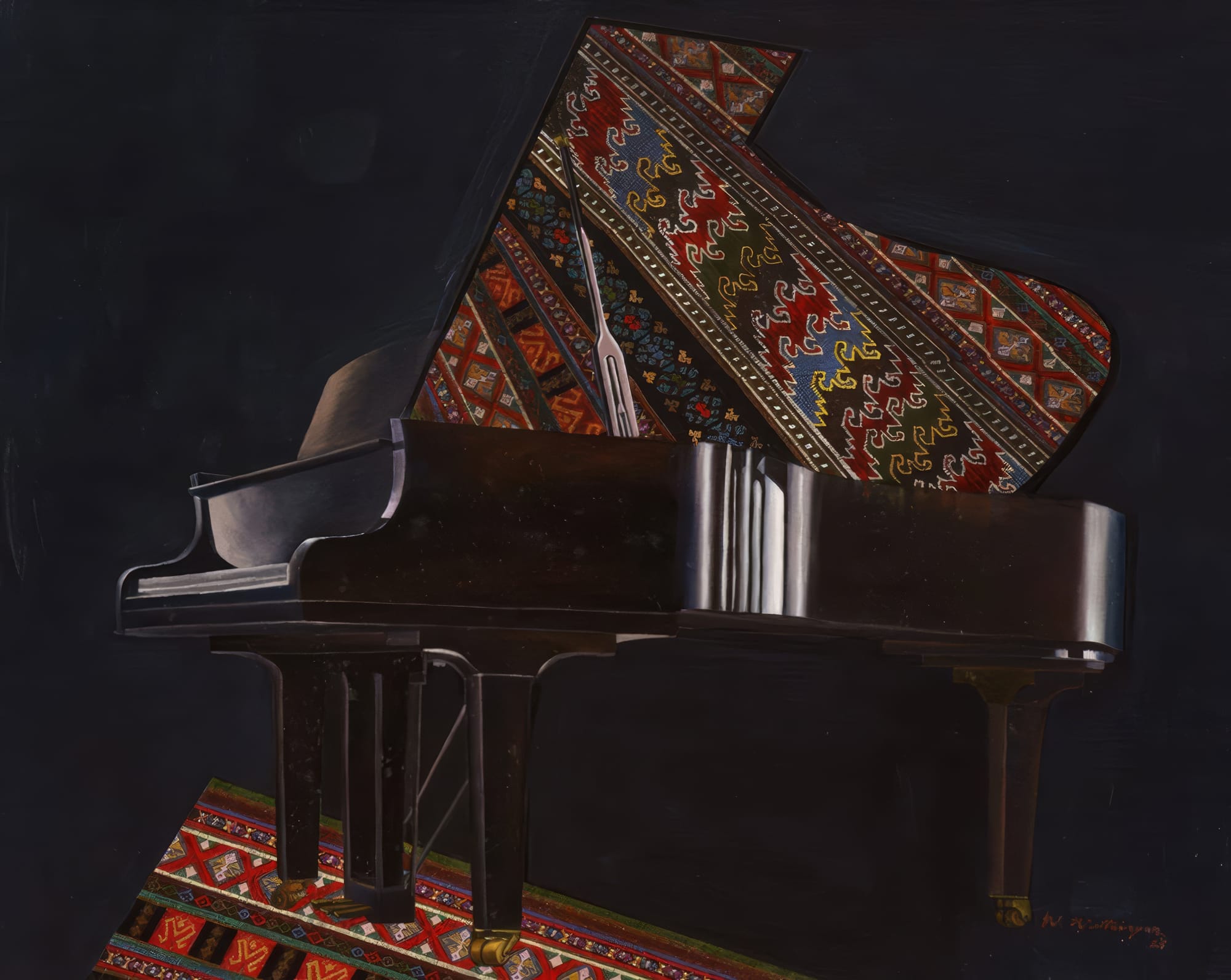 In his own symbolic language, the piano can also be read as an echo of the female form—its curved body, poised legs, and resonant interior recalling the grace and vitality he often associates with women. In this way, the instrument becomes not only a source of music but a quiet tribute to the feminine presence that runs through much of his work.