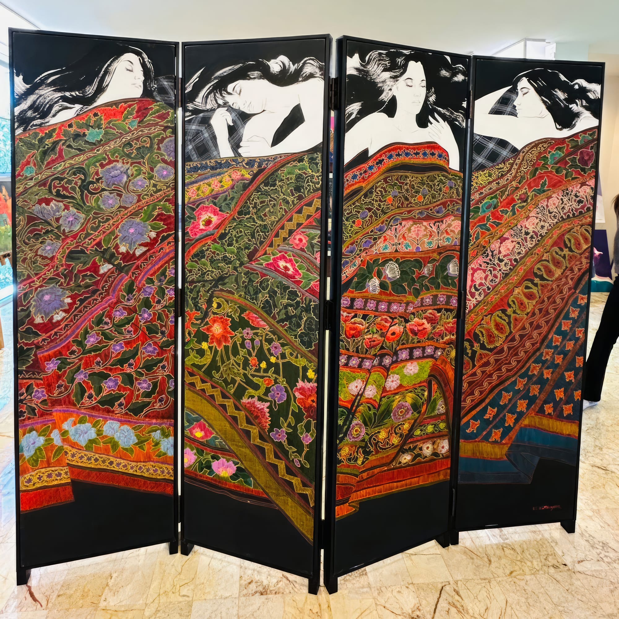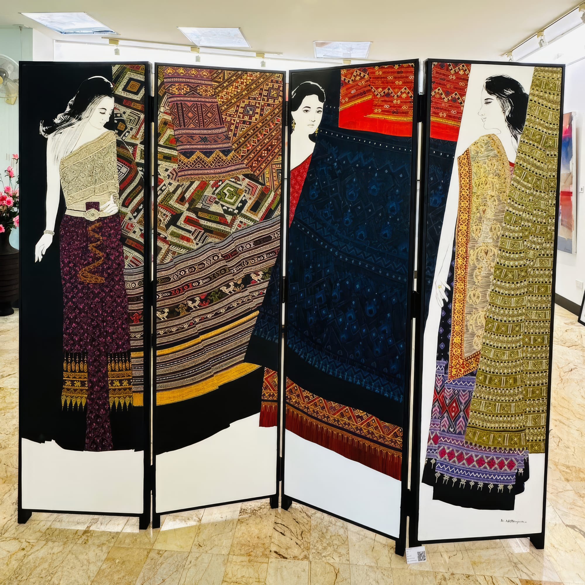 The four panels open like chapters, moving between wakefulness and sleep, between inside and outside, between East and West. Textile patterns weave these different states into a single cultural story. The women seem both unique and universal, showing cycles of time and identity. With this setup, Wattana invites us to consider how we shift roles in different situations and how light and shadow, action and rest, coexist in our lives.