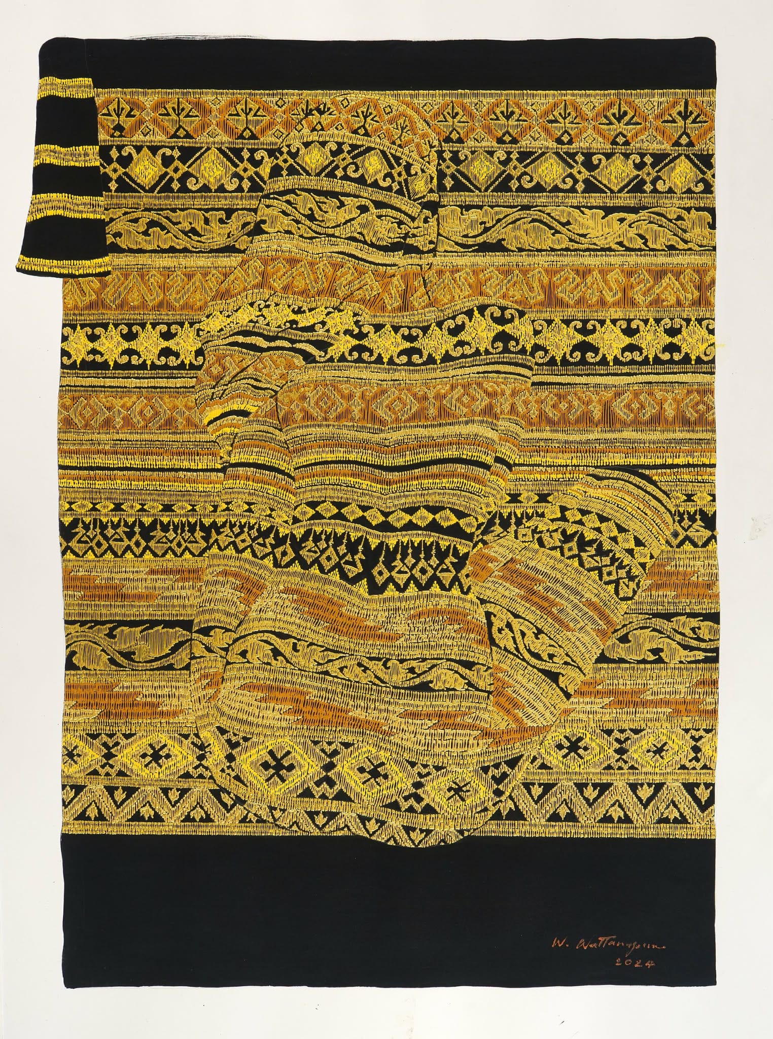 Wattana’s interest in the intricate textures and cultural meanings of handwoven fabrics dates back to his early life, when he even learned to weave on a traditional loom. This engagement became more focused after his return from the West in 2002.