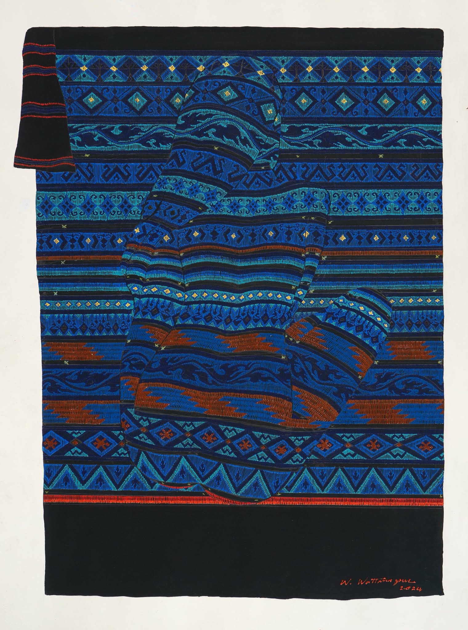 Within the patterned tube skirt, a nude female figure is woven into the fabric itself. She is not just shown on the cloth, but becomes part of its very structure, as if the weaver has placed her own body and identity into the fabric. The line between maker and object disappears. With this, Wattana honours the hidden work of women artisans and questions why creation and recognition are often kept apart.